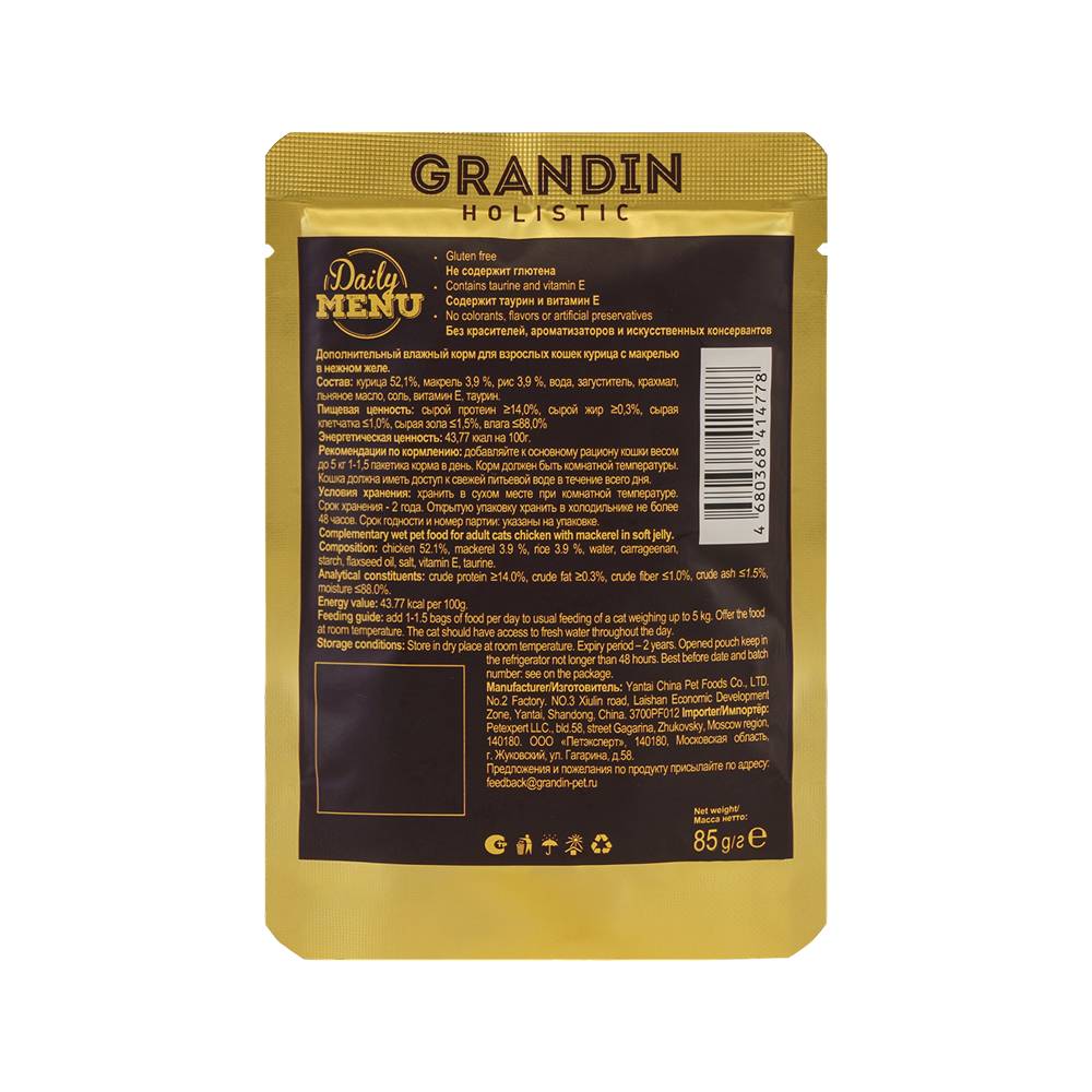 Grandin Holistic Health Privilege - вкусный дополнительный рацион для взрослых кошек. Корм изготовлен из свежего мяса курицы и макрели с добавлением аппетитного нежного желе, которое придает корму превосходный вкус.