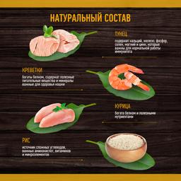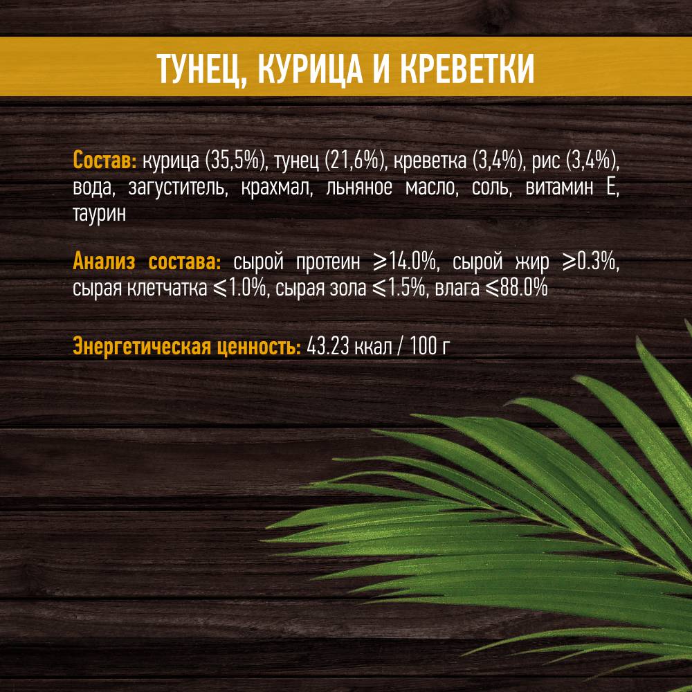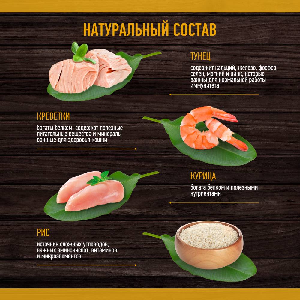 - Тунец- уникальный вид рыбы с высоким содержанием белка, обладает высокой пищевой ценностью. Богат жирными кислотами Омега-3 и Омега-6, необходимыми для поддержания иммунитета кошки и отличного состояния ее кожи и шерсти.