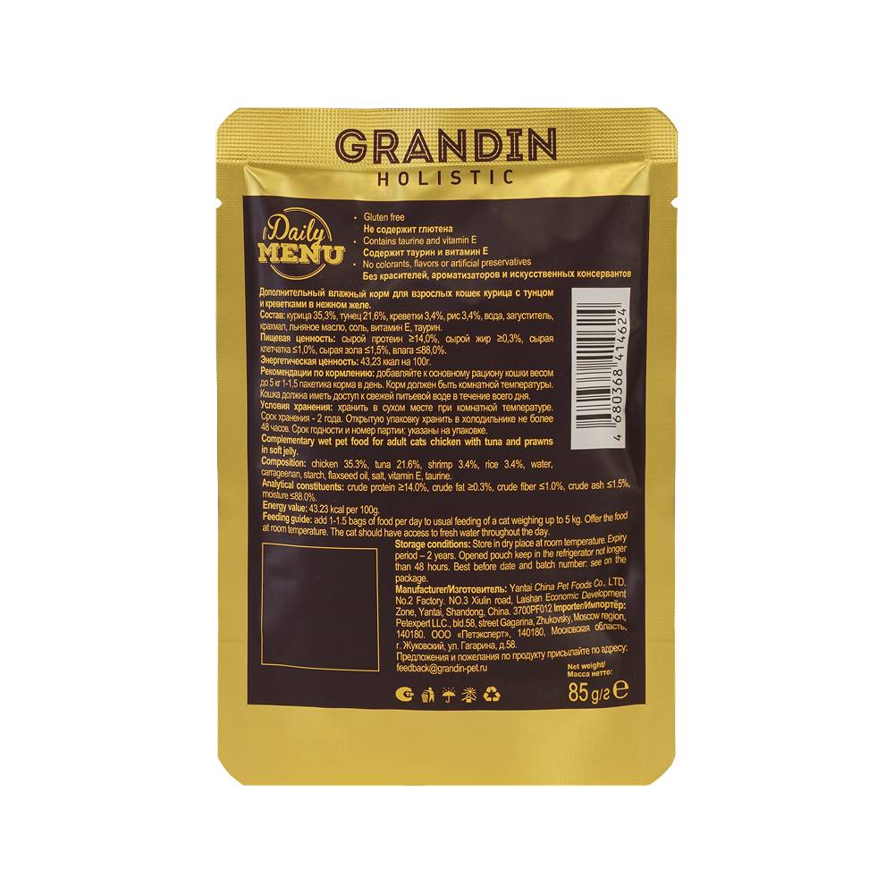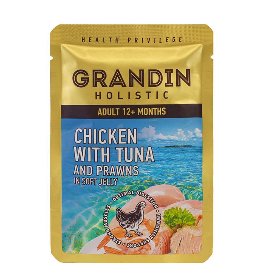 Grandin Holistic Health Privilege – вкусный дополнительный рацион для взрослых кошек. Корм изготовлен из свежего мяса тунца, курицы и креветок с добавлением аппетитного нежного желе, которое придает корму превосходный вкус.