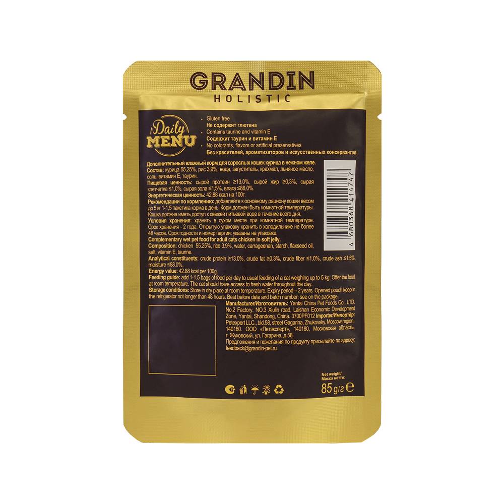 Grandin Holistic Health Privilege - вкусный дополнительный рацион для взрослых кошек. Корм изготовлен из свежего мяса курицы с добавлением аппетитного нежного желе, которое придает корму превосходный вкус.