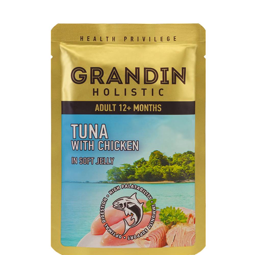 Grandin Holistic Health Privilege - вкусный дополнительный рацион для взрослых кошек. Корм изготовлен из свежего мяса тунца и курицы с добавлением аппетитного нежного желе, которое придает корму превосходный вкус.