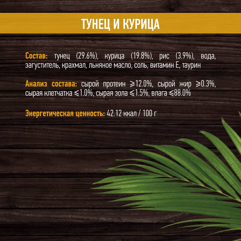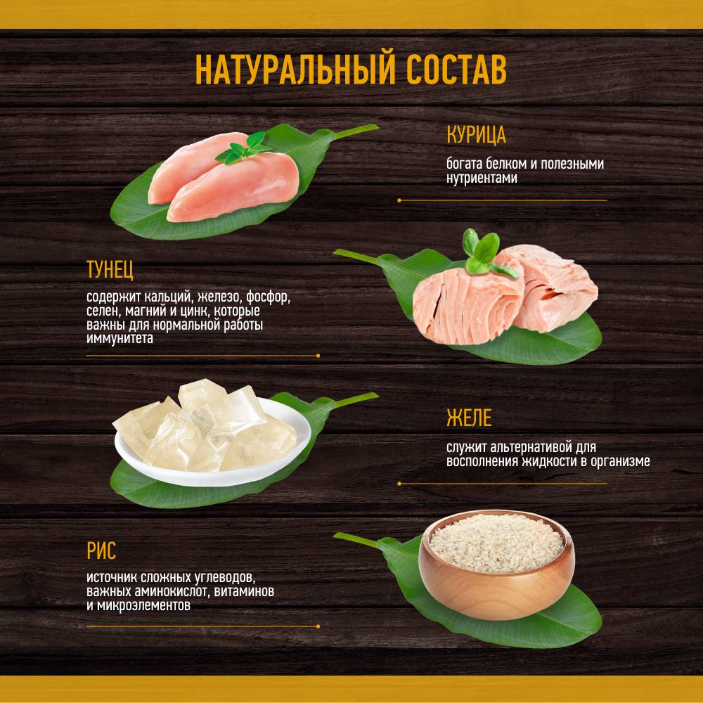 - Тунец- уникальный вид рыбы с высоким содержанием белка, обладает высокой пищевой ценностью. Богат жирными кислотами Омега-3 и Омега-6, необходимыми для поддержания иммунитета кошки и отличного состояния ее кожи и шерсти.