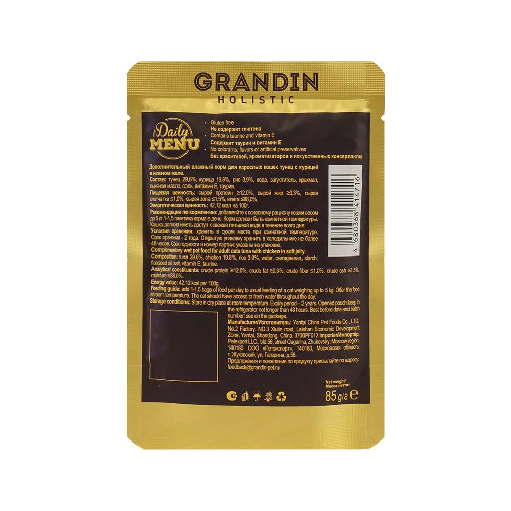 Grandin Holistic Health Privilege - вкусный дополнительный рацион для взрослых кошек. Корм изготовлен из свежего мяса тунца и курицы с добавлением аппетитного нежного желе, которое придает корму превосходный вкус.