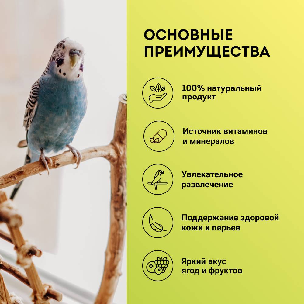 - Природный источник витаминов и минералов, так необходимых для крепкого здоровья попугаев.