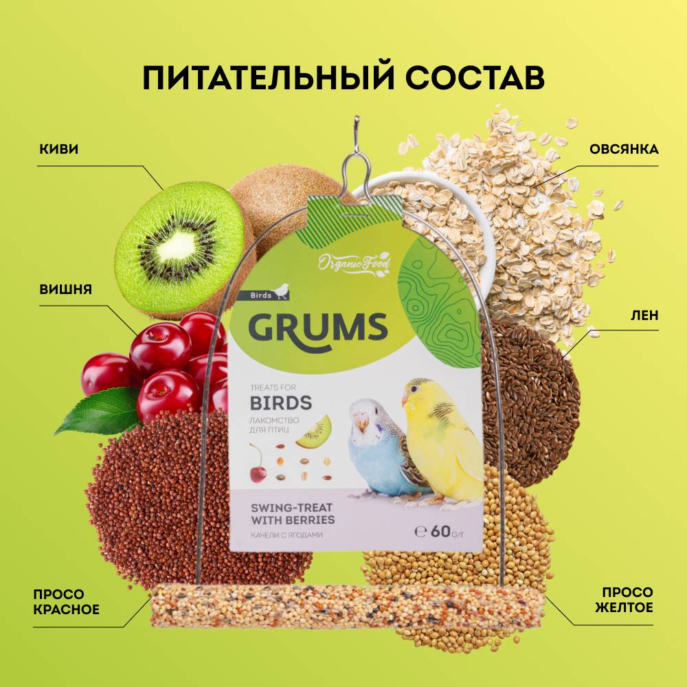 Качели-лакомство для птиц GRUMS станут аппетитным дополнением к основному рациону, а также разнообразят времяпрепровождение попугая. Побалуйте своего пернатого питомца вкусным и полезным деликатесом без вреда для его здоровья.