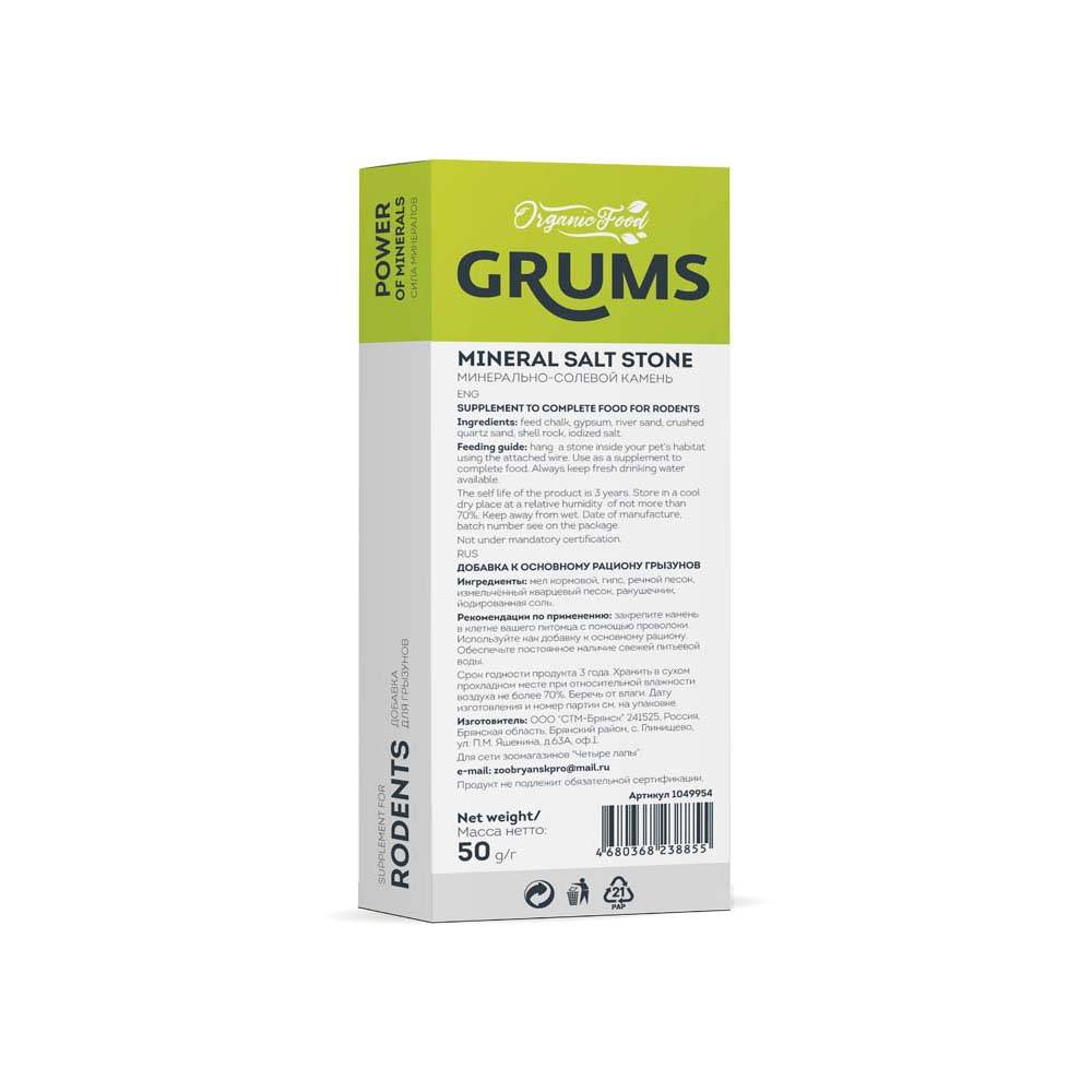 Камень минерально-солевой GRUMS станет полезной добавкой к основному рациону грызунов. Способствует восполнению дефицита минеральных веществ в организме грызунов.