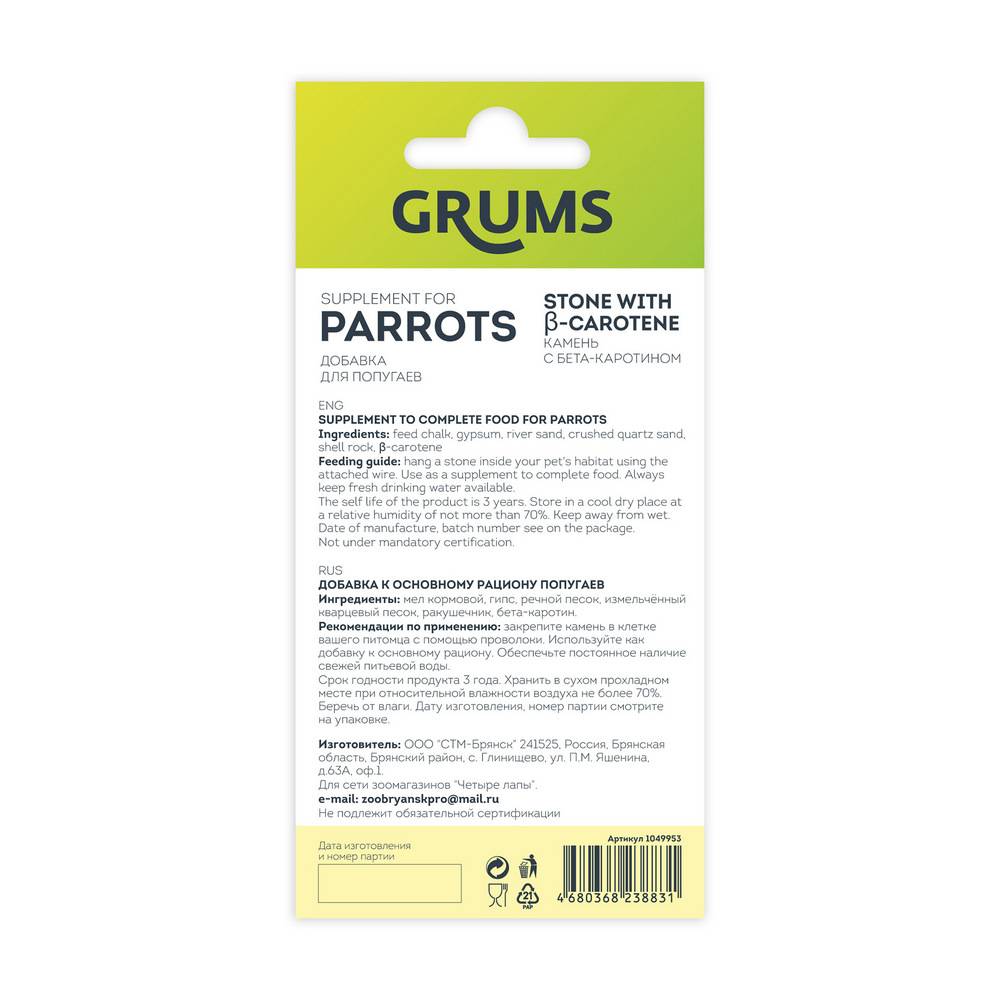 Камень минеральный GRUMS станет полезной добавкой к основному рациону попугаев. Способствует восполнению дефицита минеральных веществ в организме попугаев.