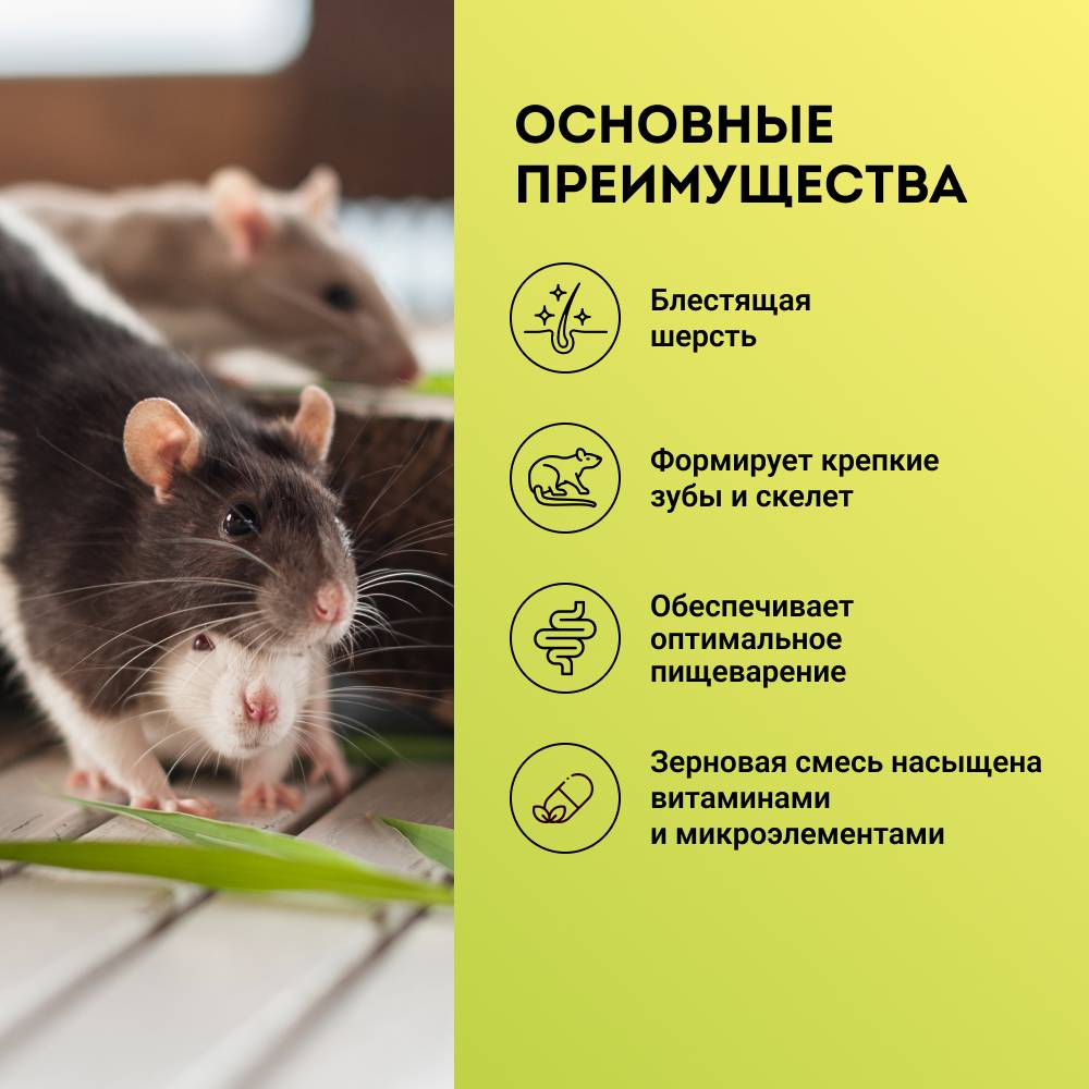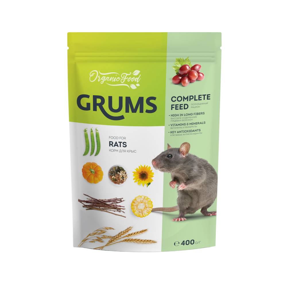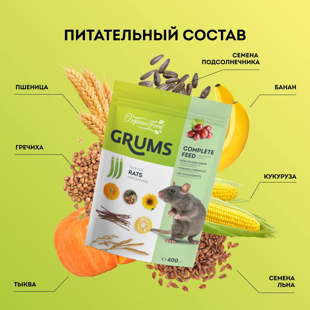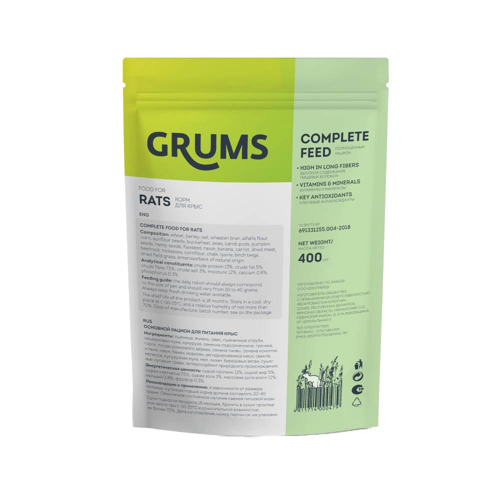 Корм GRUMS содержит различные компоненты для разнообразного питания крыс. Зерновая смесь насыщена витаминами и микроэлементами, которые гарантируют питомцам здоровье, блестящую шерсть, оптимальное пищеварение, крепкие зубы и скелет.