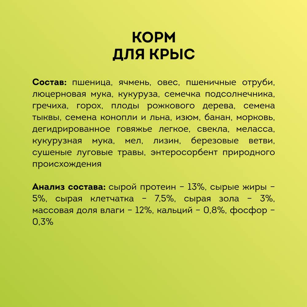 Крысы всеядны, именно поэтому в составе присутствует сушёное говяжье легкое, которое насыщает питомца полезным белком. Банан в составе обеспечивает хорошую поедаемость корма.