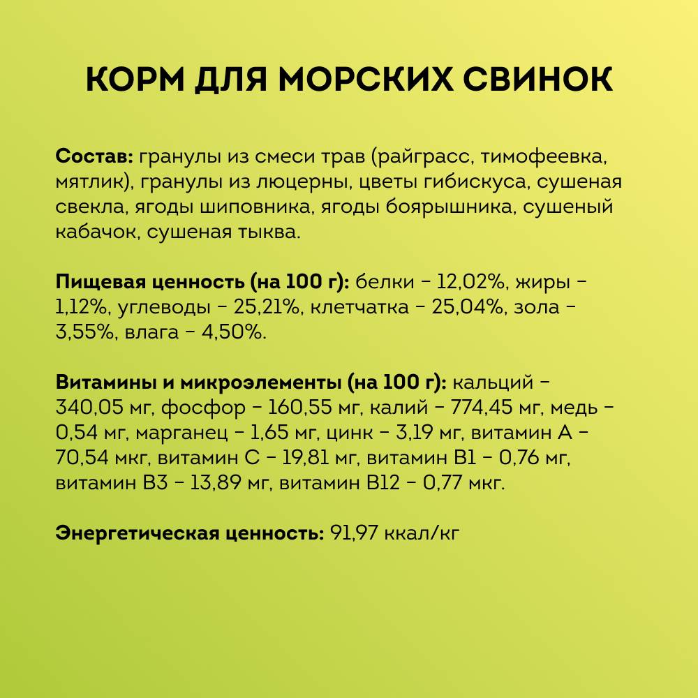 - Беззерновая формула подходит для диетического питания морских свинок.