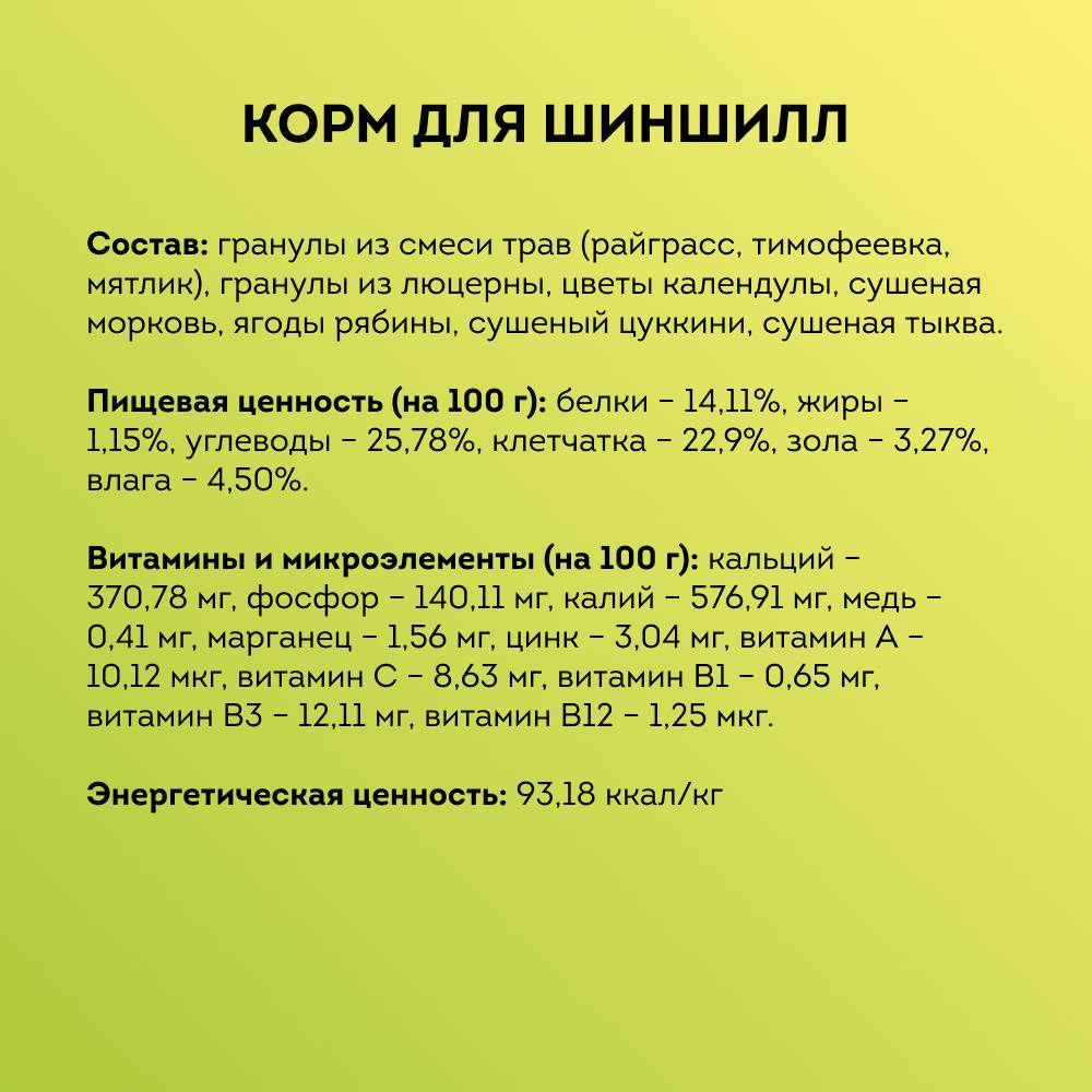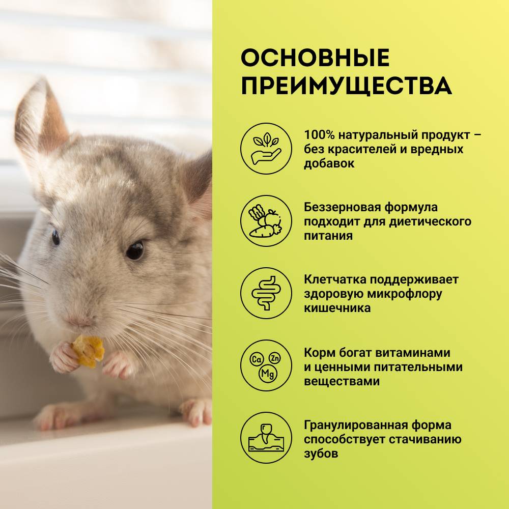 - Беззерновая формула подходит для диетического питания шиншилл.