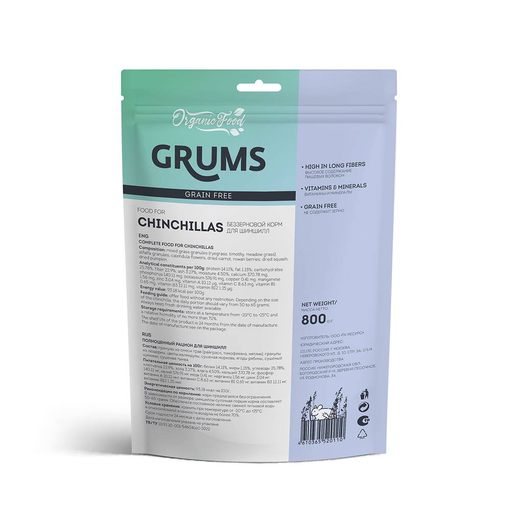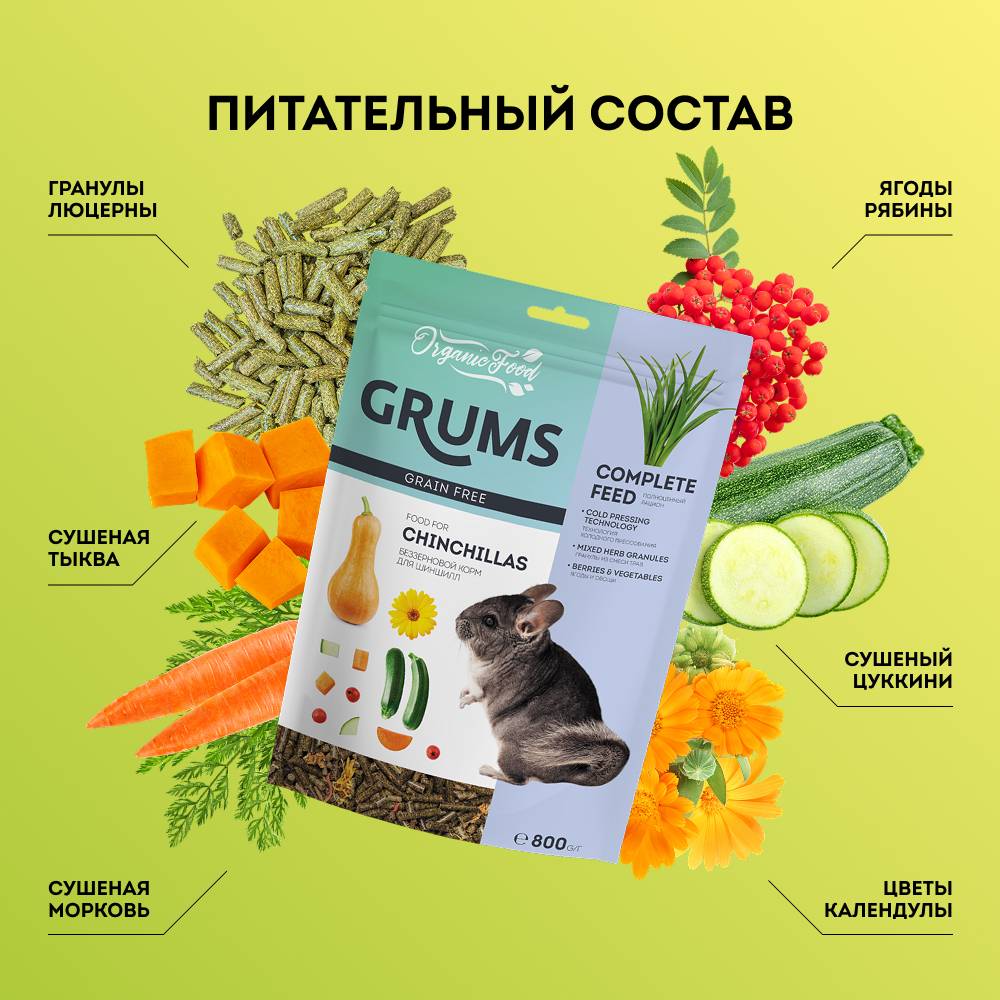 Полнорационный беззерновойкорм GRUMS для шиншилл разработан с учетом их естественных потребностей. В его составе только натуральные компоненты, богатые клетчаткой, которые способствуют правильному пищеварению и поддержанию здоровья питомца.