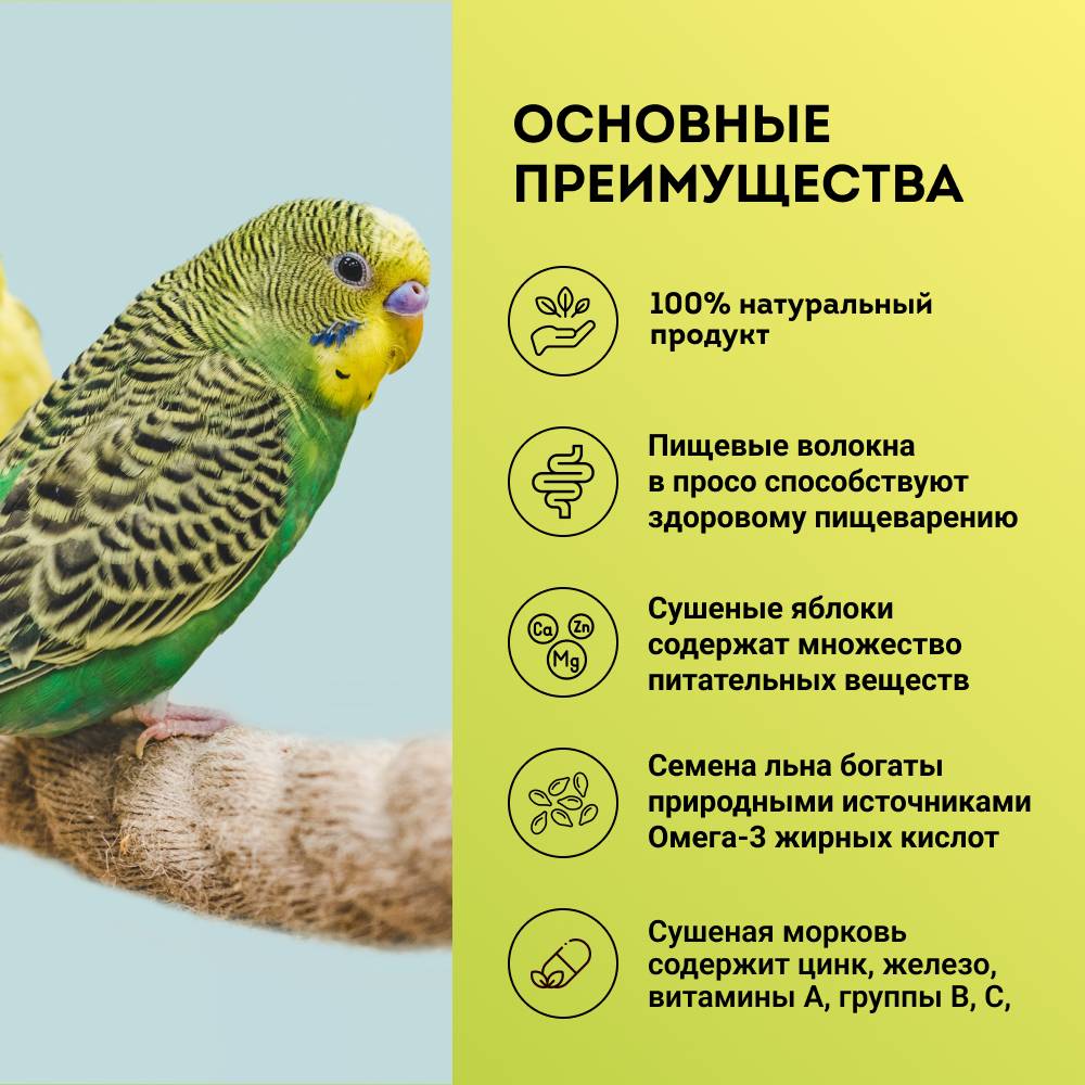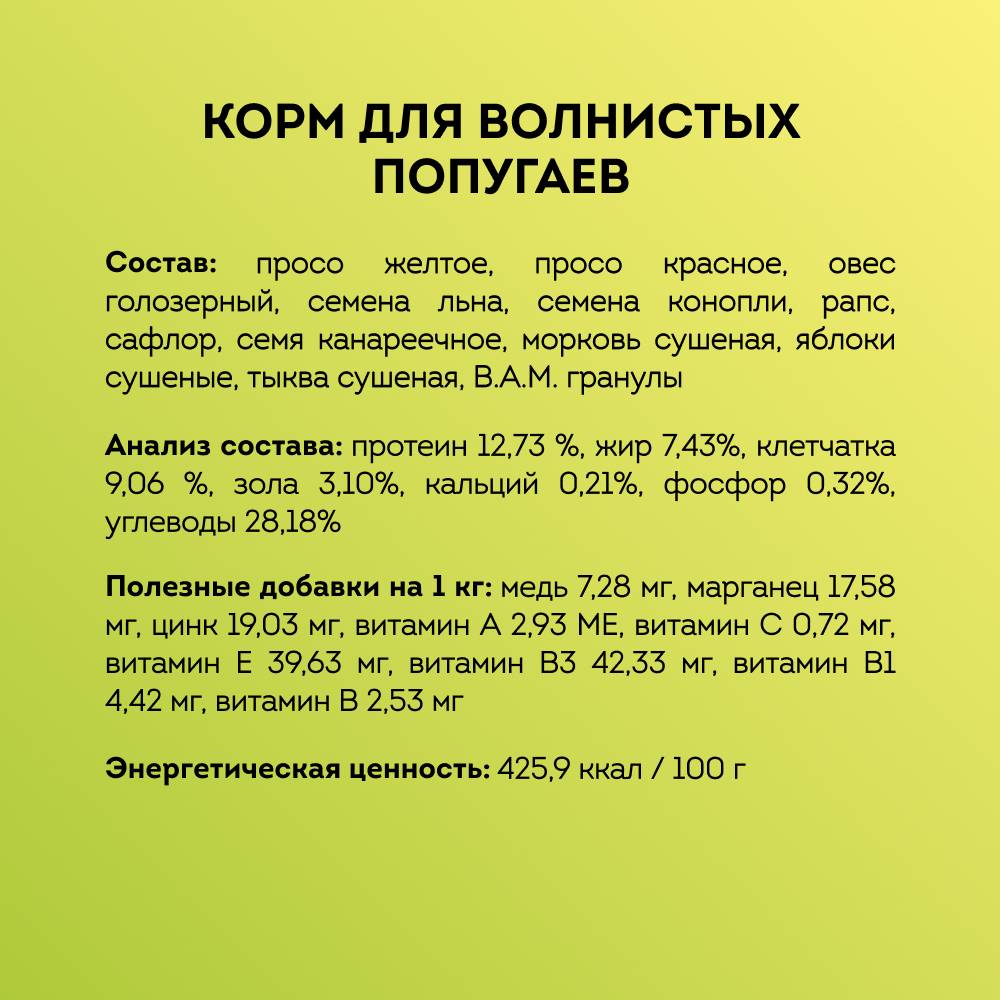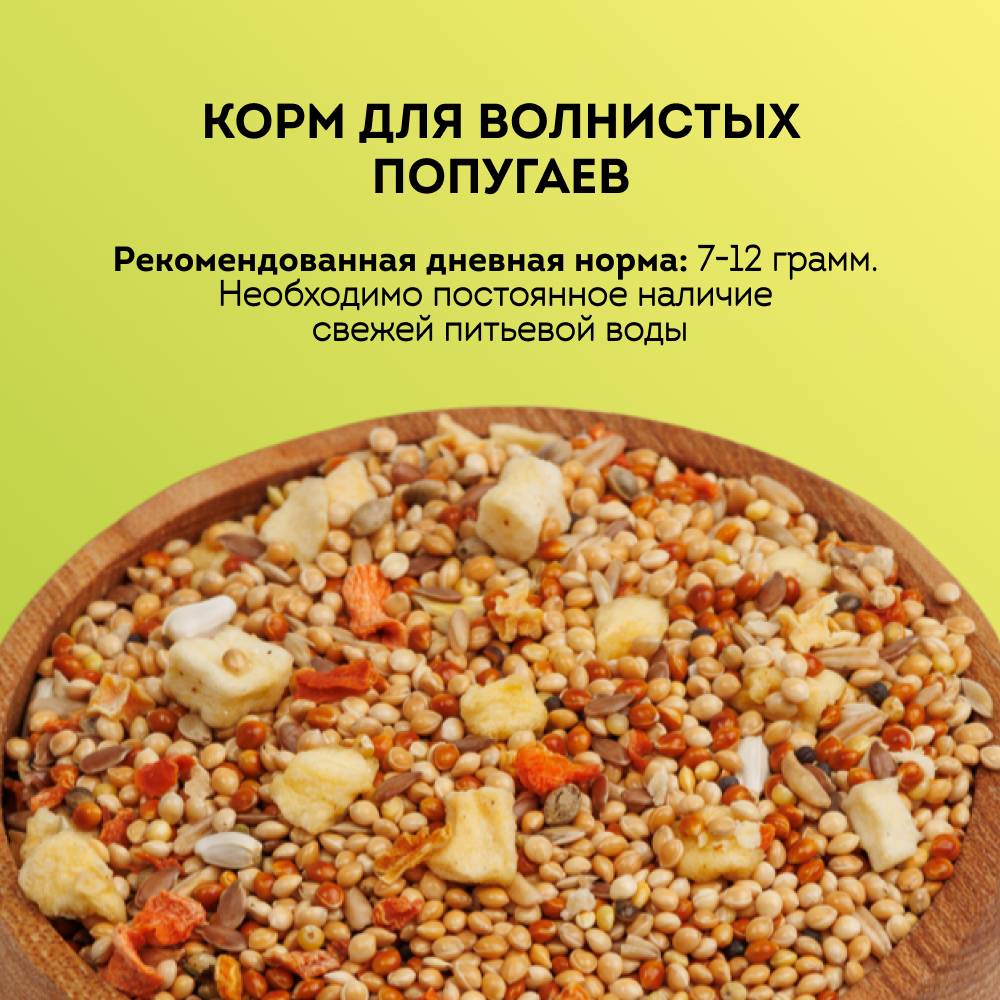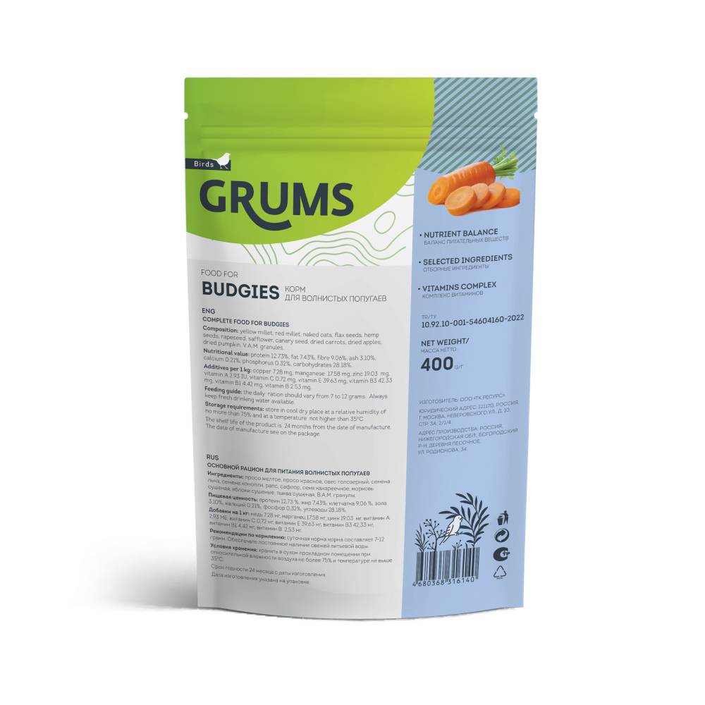 Основной рацион GRUMS содержит различные компоненты для разнообразного питания волнистых попугаев. Зерновая смесь насыщена витаминами и микроэлементами, необходимыми для здорового и активного образа жизни пернатых.