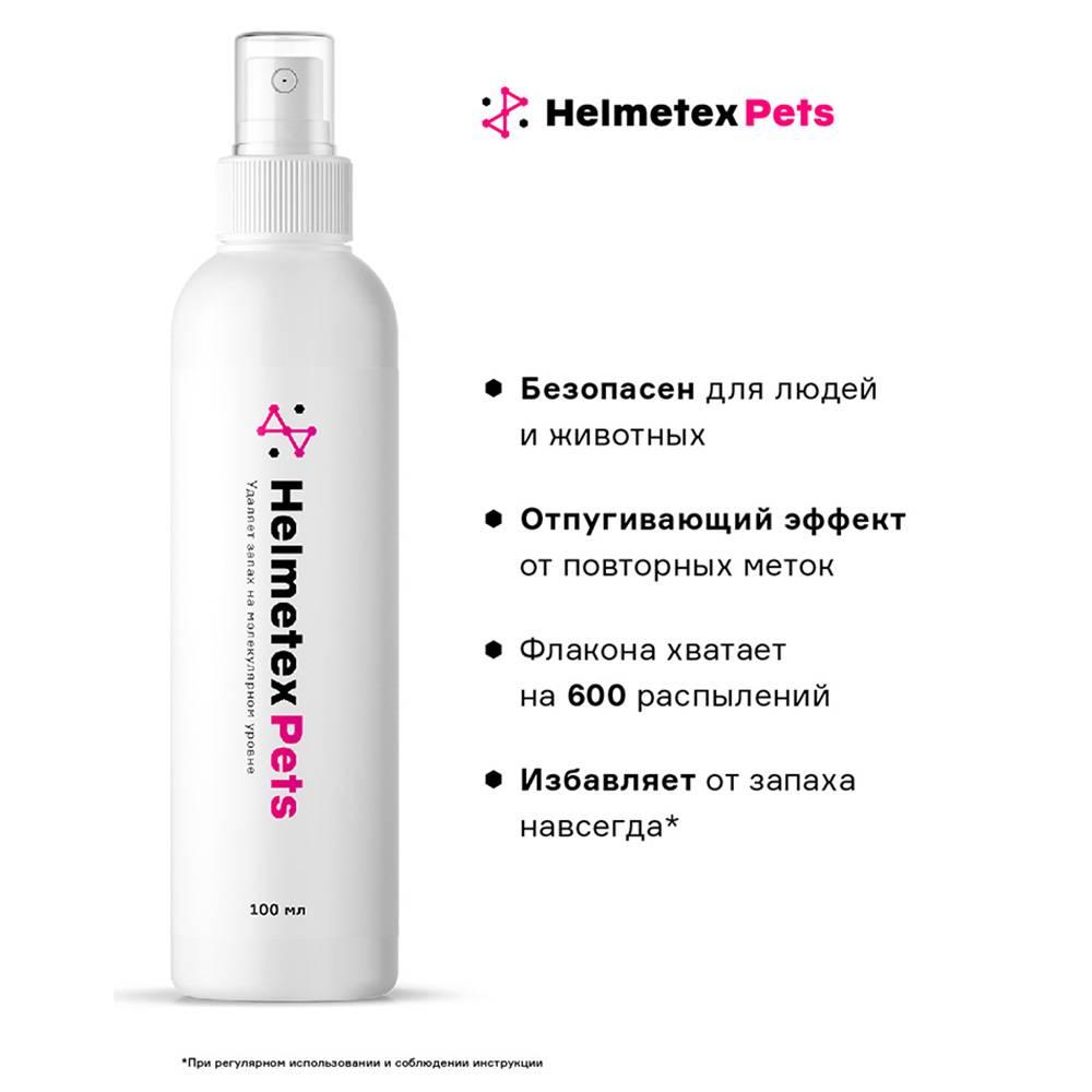 Helmetex – это не освежитель воздуха, который маскирует запах лишь временно, а профессиональное средство, разработанное российскими учеными,которое удаляет источник неприятного запаха животных с вещей и предметов: с дивана, кресла, стула и другой мягкой мебели, с ковров, ламината и других напольных покрытий, с подушек, одеял, занавесок, дверей, стен и т.д., а также эффективен для обработки в труднодоступных местах.