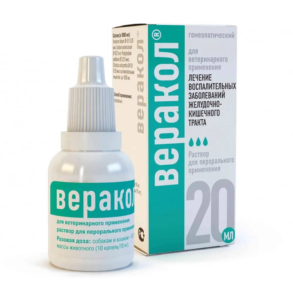 Гомеопатическое средство Веракол, благодаря натуральным компонентам оказывает мягкое противовоспалительное действие, регулирует моторику желудочно-кишечного тракта. Веракол по степени воздействия на организм теплокровных животных относится к малоопасным веществам, в рекомендуемых дозах не оказывает местнораздражающего, резорбтивно-токсического, мутагенного и сенсибилизирующего действия.