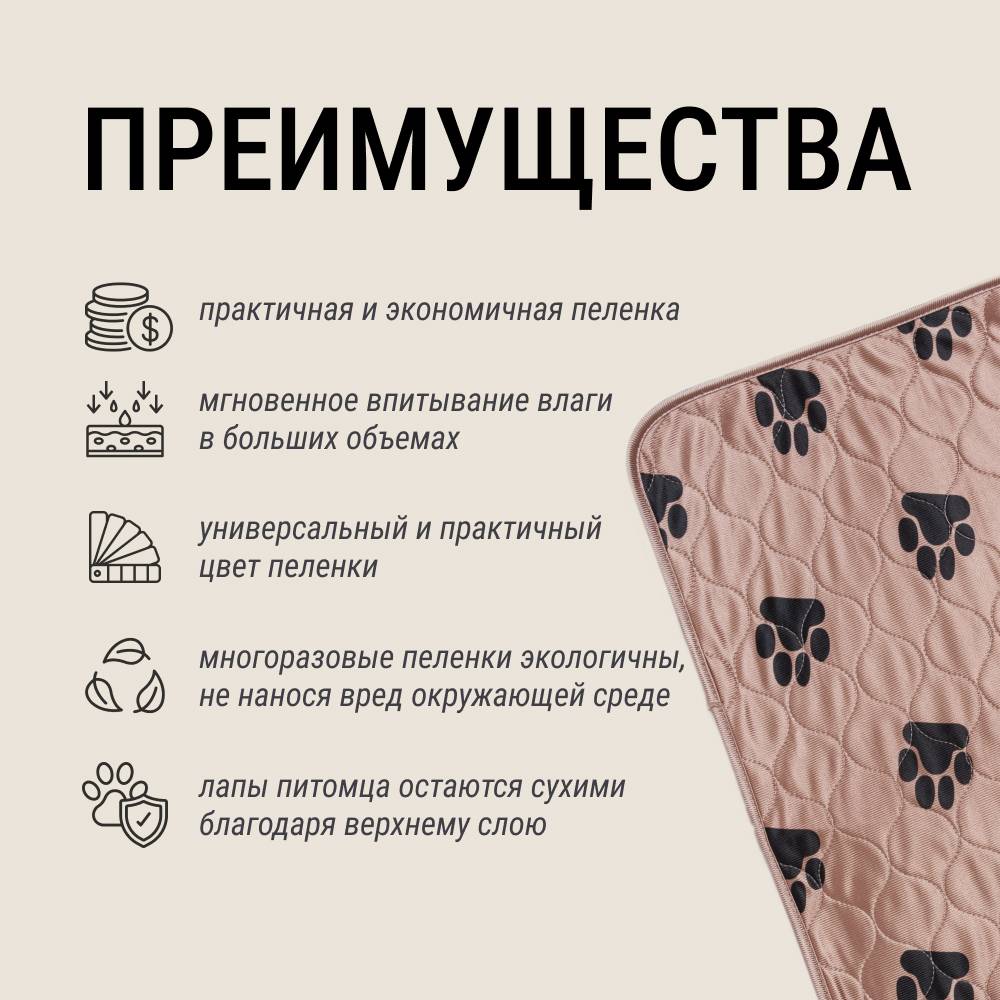 Отличная пелёнка. Сначала стелила поверх одноразовую, потом убрала и оставила только эту, собачка без проблем перешла на нее. Выглядит качественно, переживает стирки, хорошо впитывает, и нет неприятных запахов. И я оценила мудрость дизайнера, который сделал принт с лапками. Может не специально, но за счёт лапок какашки вообще в глаза не бросаются :) Купила сразу 4 штуки, потом купила ещё 4.Комментарий