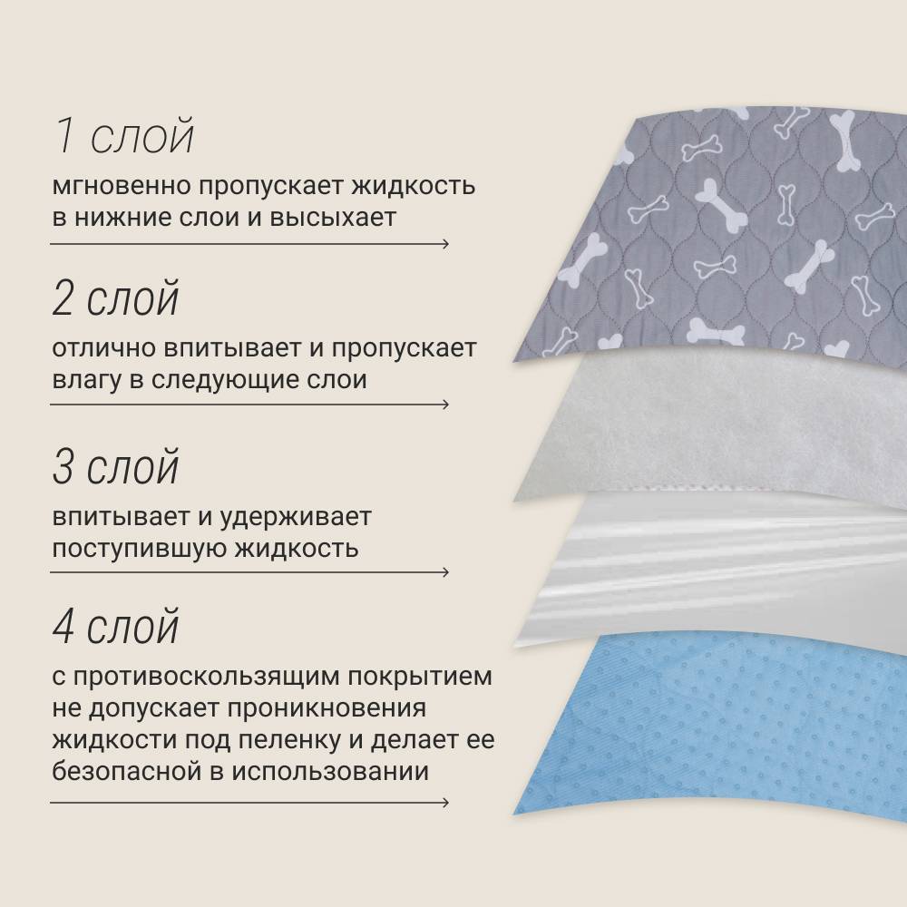 - Четвертый слой с противоскользящим покрытием не допускает проникновения жидкости под пеленку и делает ее безопасной в использовании.