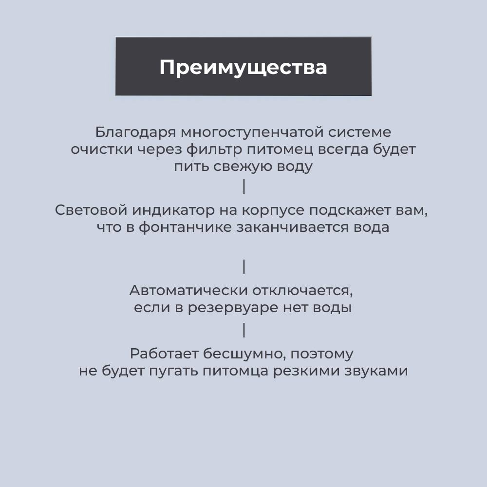 - Благодаря многоступенчатой системе очистки через фильтр питомец всегда будет пить свежую воду.