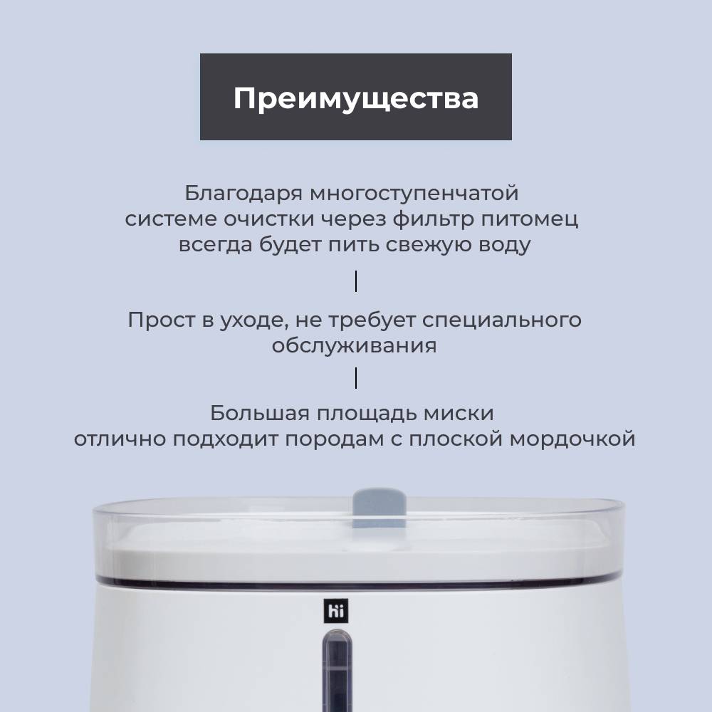 Вода в обычной миске требует ежедневной замены, так как она застаивается и в нее попадает посторонний мусор. Из автоматической поилки четвероногий друг всегда получит чистую воду благодаря многоступенчатой системе фильтрации.