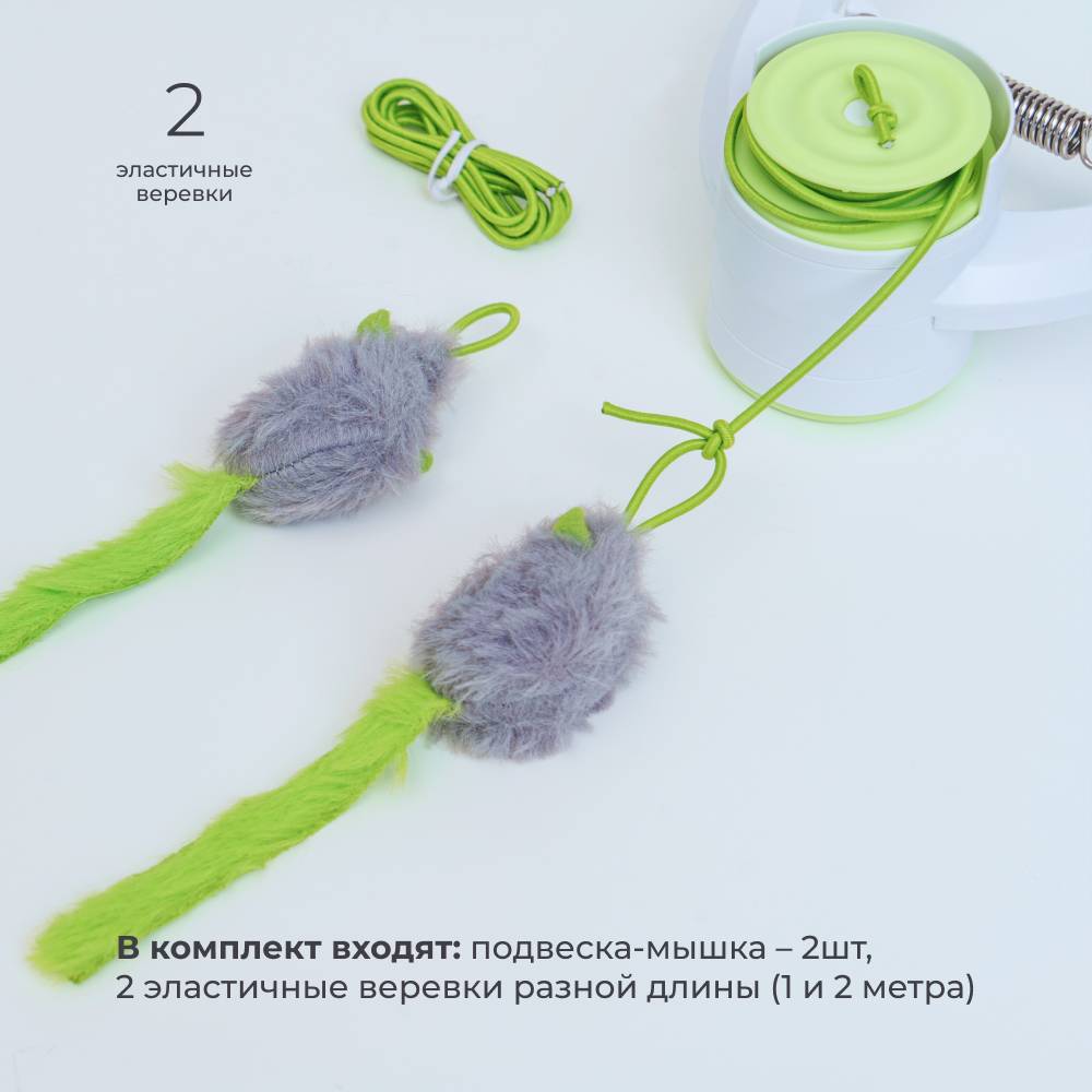 - В комплект входят: основание с антискользящим крепежом (диапозон крепления 3-14 см, подвеска-мышка - 2шт., 2 эластичные веревки разной длины (1 и 2метра), USB кабель для зарядки, инструкция.