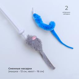 - В комплекте 2 сменные насадки – мышка и хвост, которые разнообразят игры вашего питомца, а также USB зарядка.
