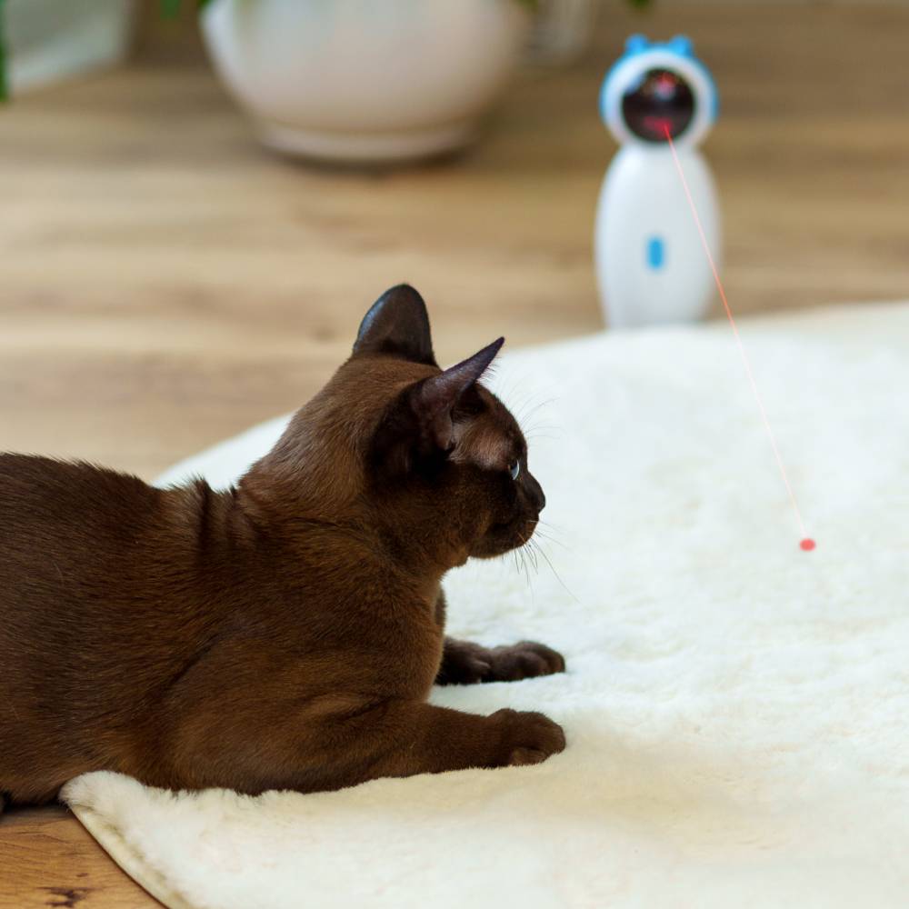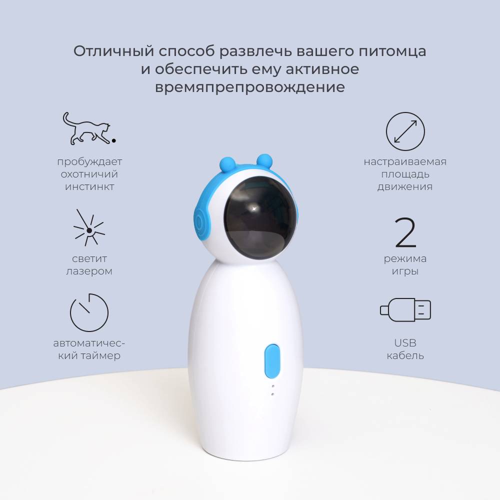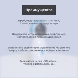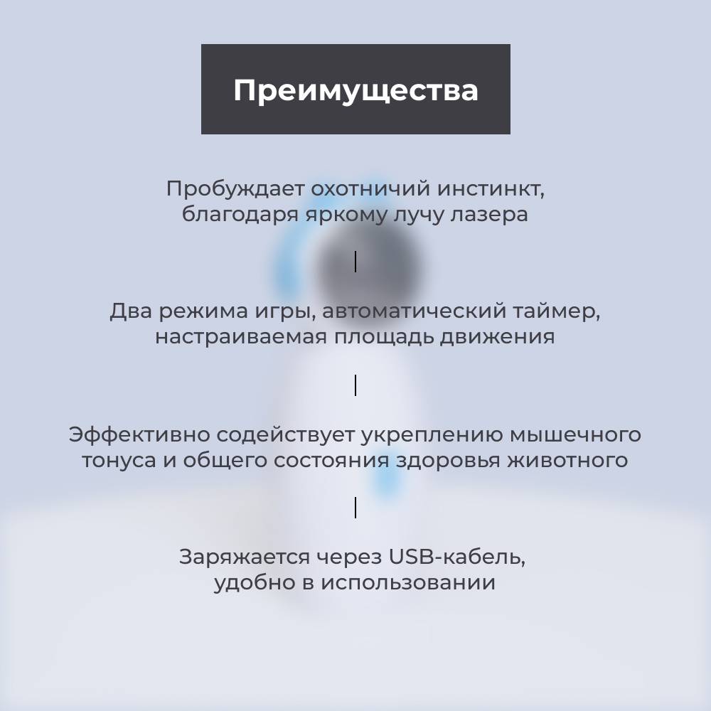Лазер создаёт яркий световой луч, который автоматически перемещается по комнате, привлекая внимание кошки и побуждая её к игре. Благодаря лазеру питомец будет энергично передвигаться, совершать прыжки и преследовать световое пятно, что эффективно содействует укреплению мышечного тонуса и общего состояния здоровья животного.