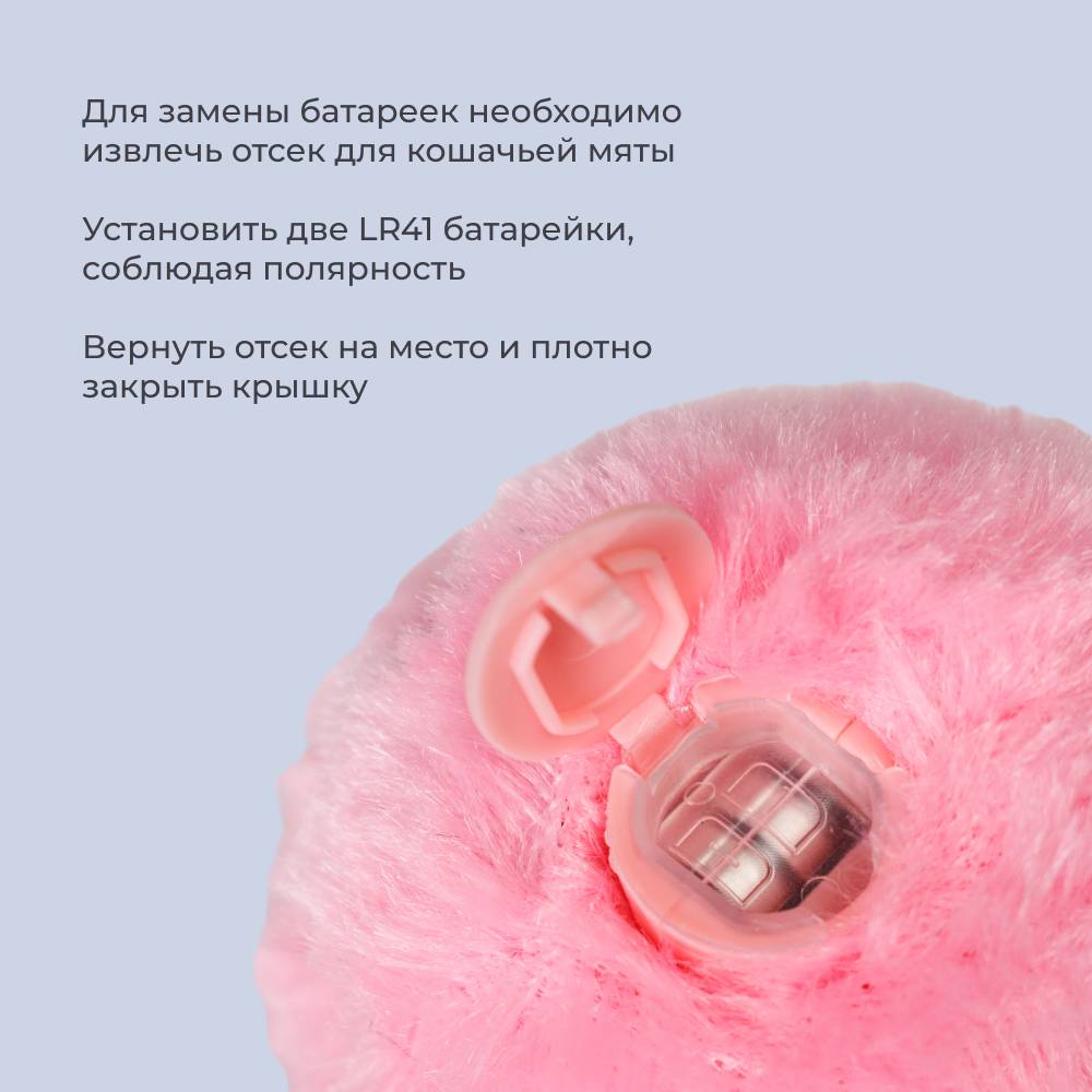 Для активации игрушки необходимо снять защиту. Для замены батареек необходимо извлечь отсек для кошачьей мяты, установить две LR41 батарейки, соблюдая полярность, вернуть отсек на место и плотно закрыть крышку.
