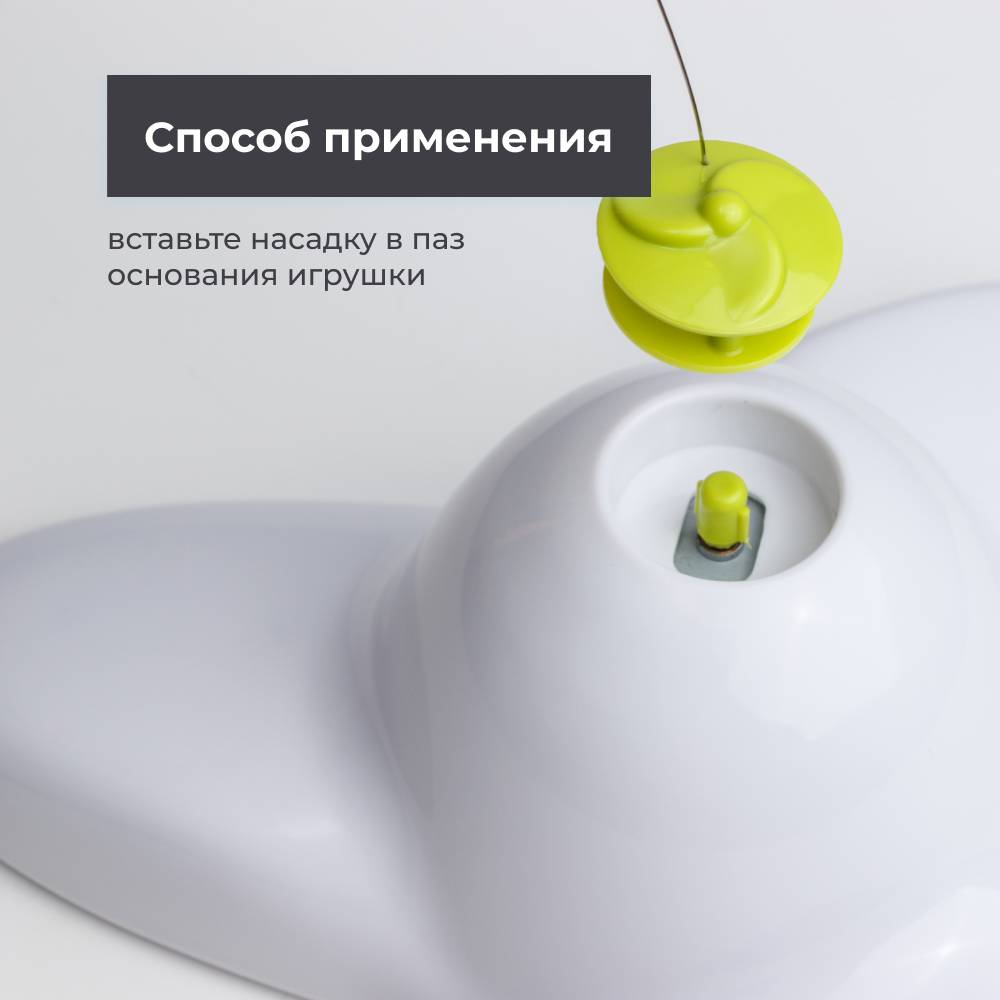 Вставьте насадку в паз основания игрушки и нажмите кнопку для включения. Для выключения повторно нажмите на кнопку.