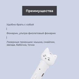 - Игрушка показывает различные лазерные проекции: мышка, смайлик, звезда, бабочка, точка.