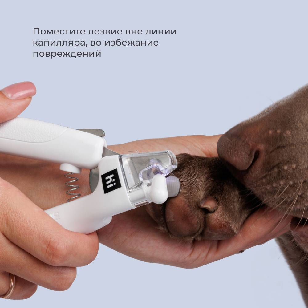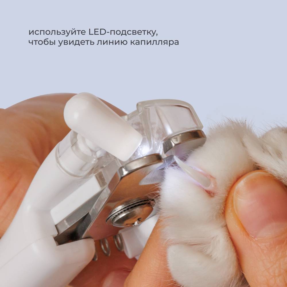 Используйте LED-подсветку, чтобы увидеть линию капилляра. Поместите лезвие вне линии капилляра во избежание повреждений. Рекомендуется подстригать когти домашним животным каждые 1-2 недели.