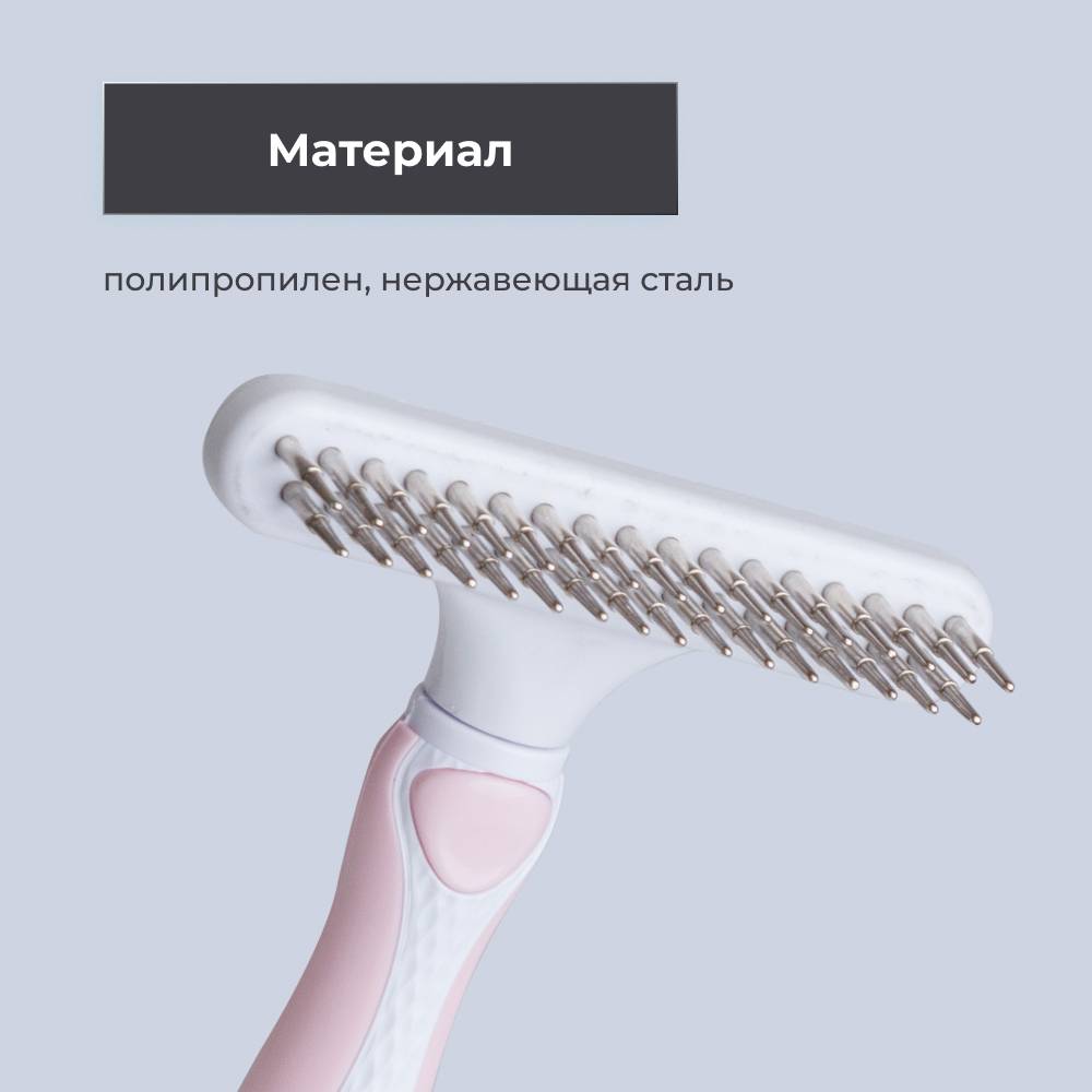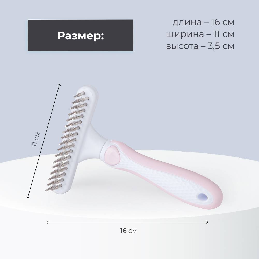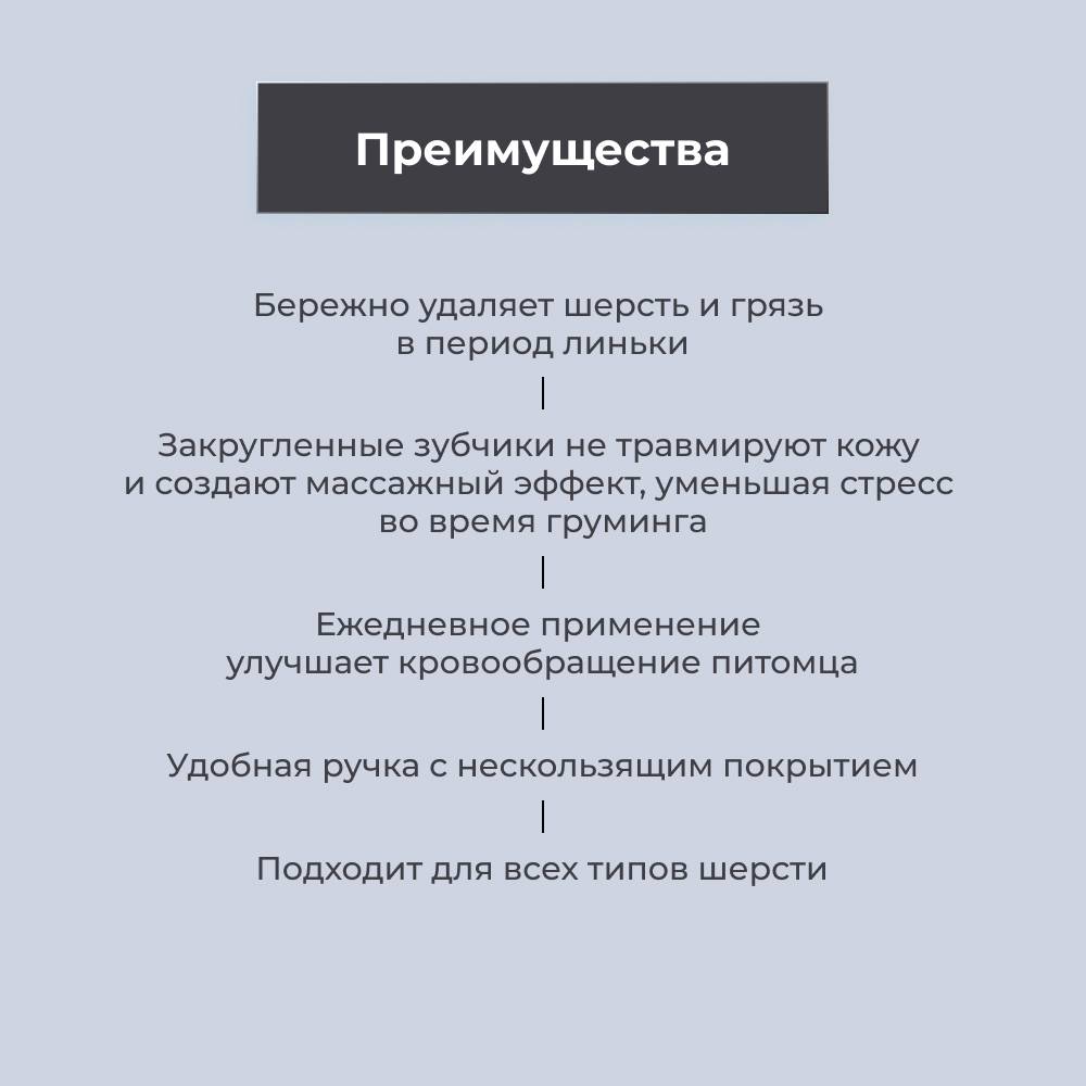 - Закругленные зубчики не травмируют кожу и создают массажный эффект, уменьшая стресс во время груминга.