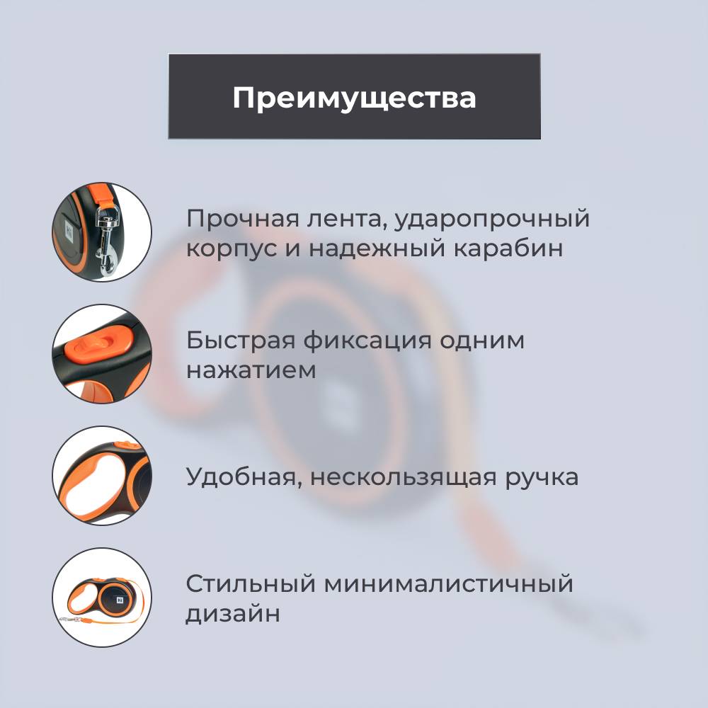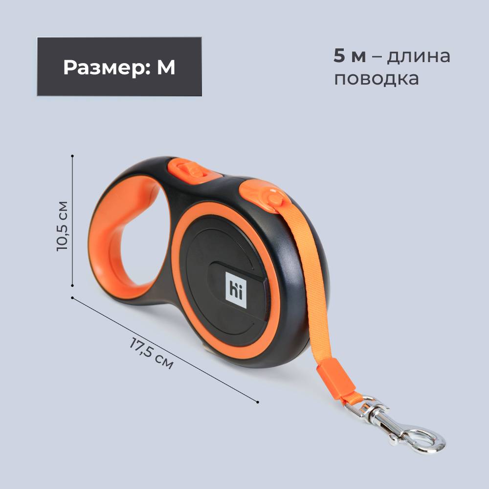 Размеры: М – 17,5х10,5 см; 5 м – длина поводка, 25 кг – максимальный вес собаки.