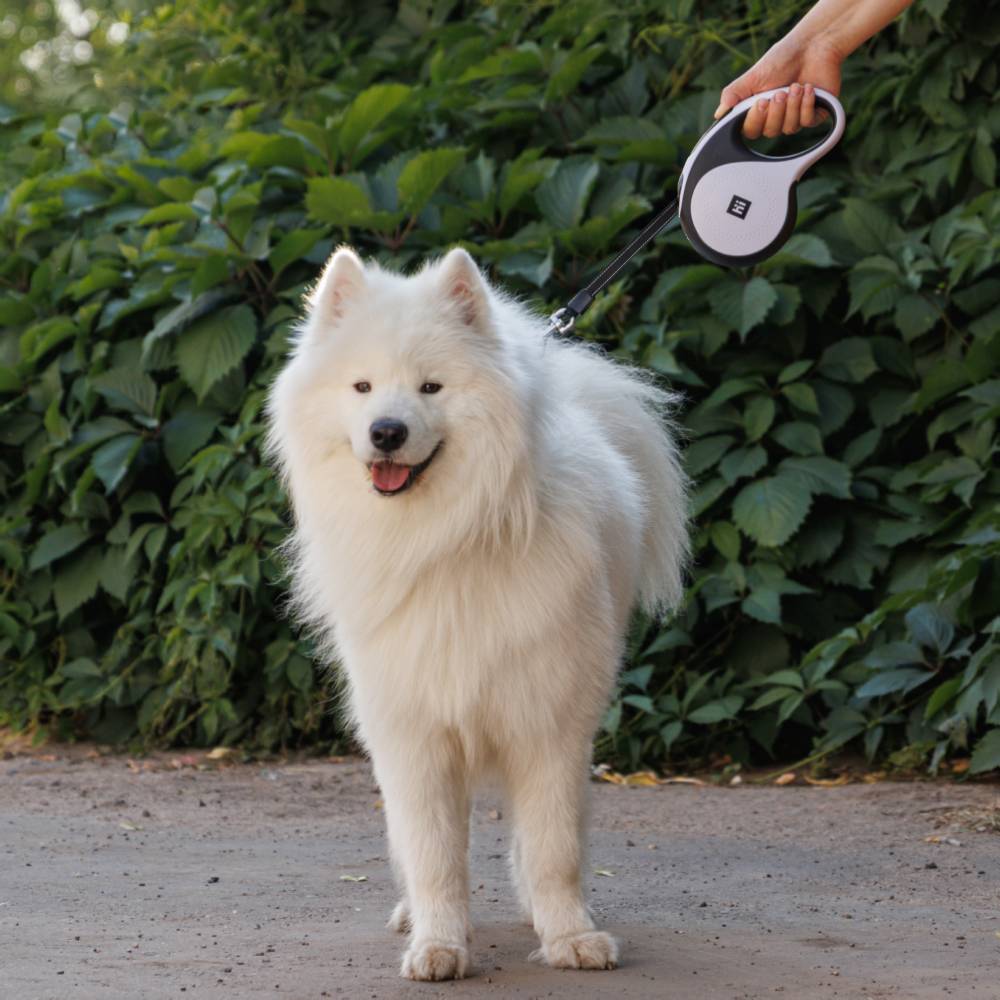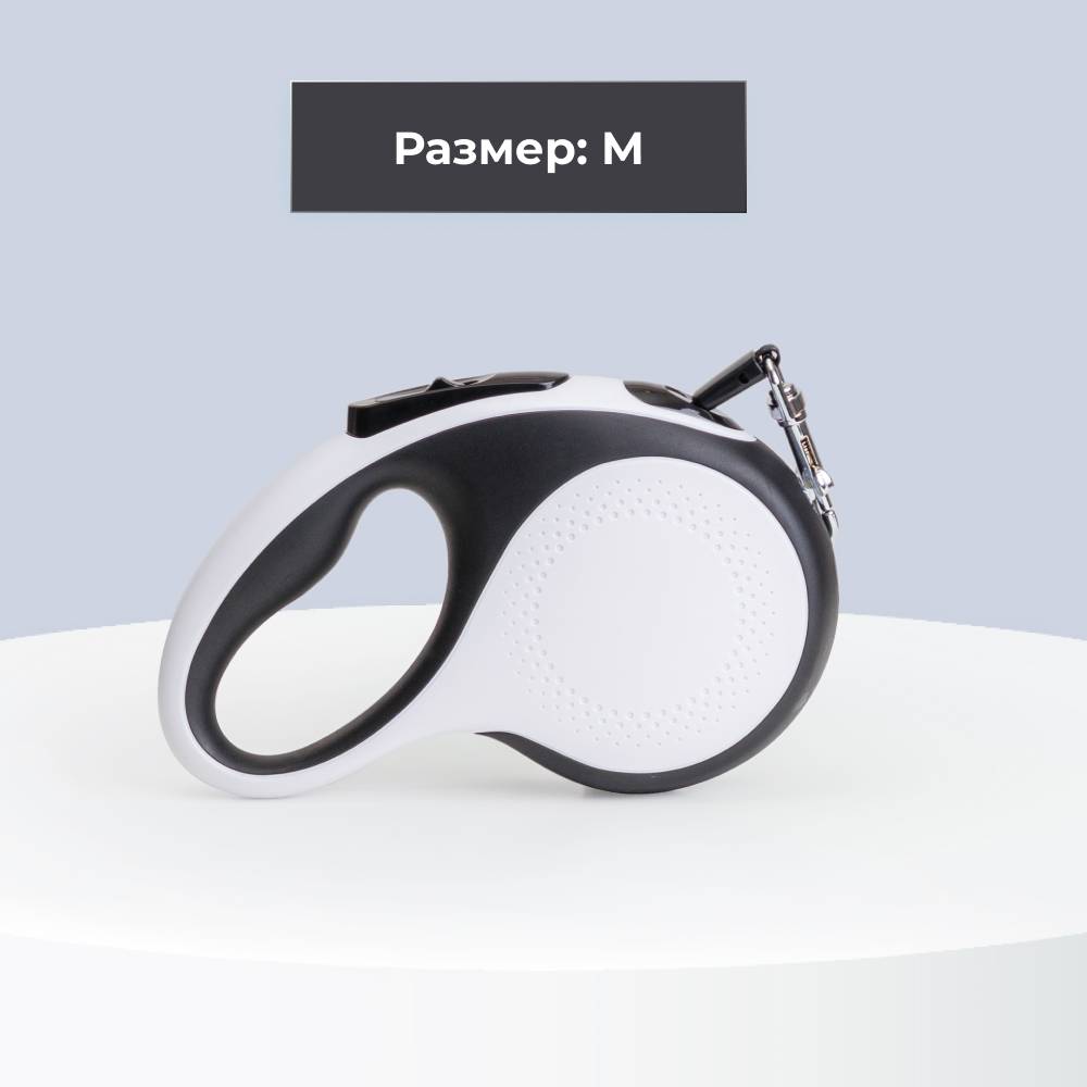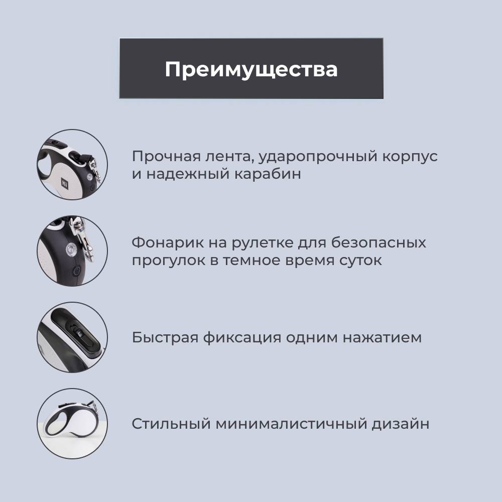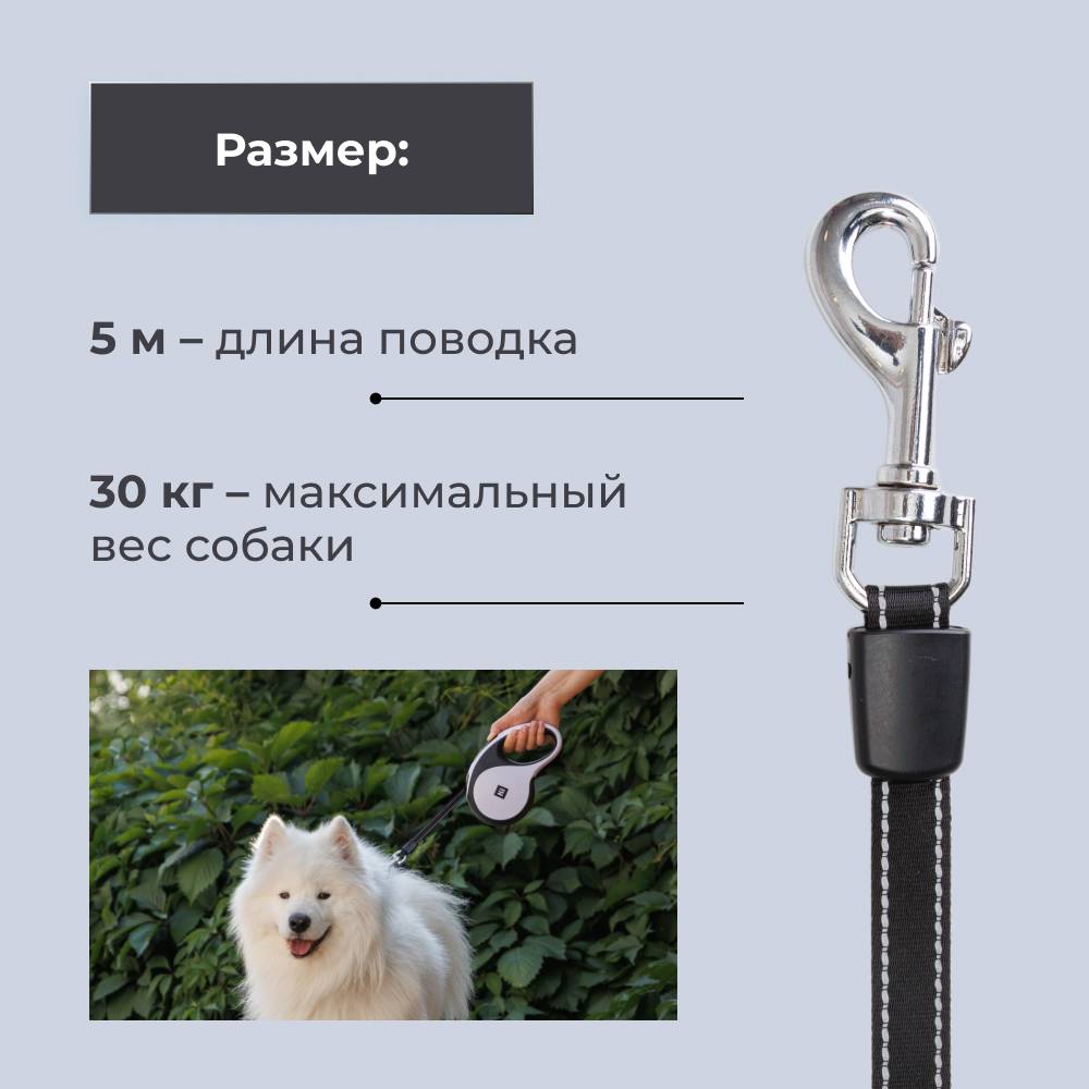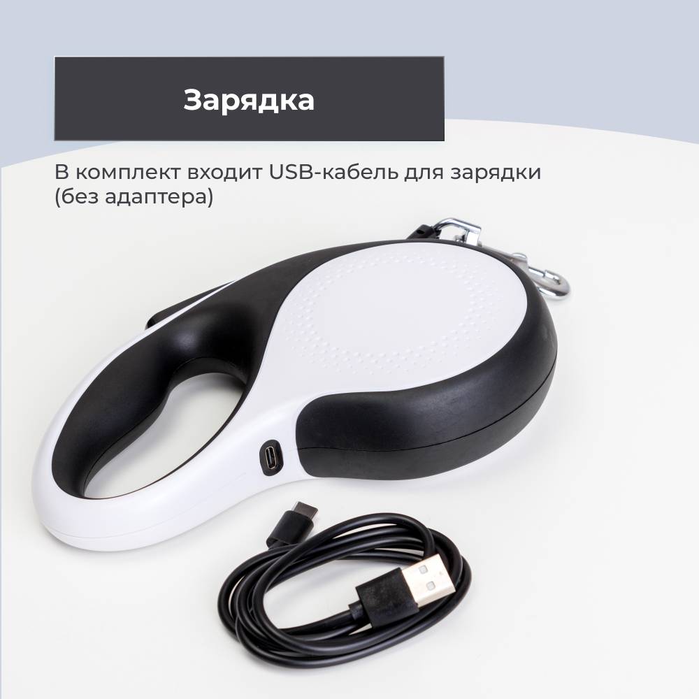 Поводок-рулетка для собак с фонариком. Длина поводка - 5 метров, максимальный вес собаки - 30 кг, прочная лента, ударопрочный корпус, фиксация одним нажатием, надежный карабин, LED фонарик, зарядка с USB.
