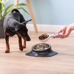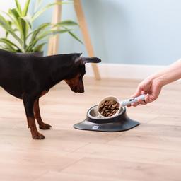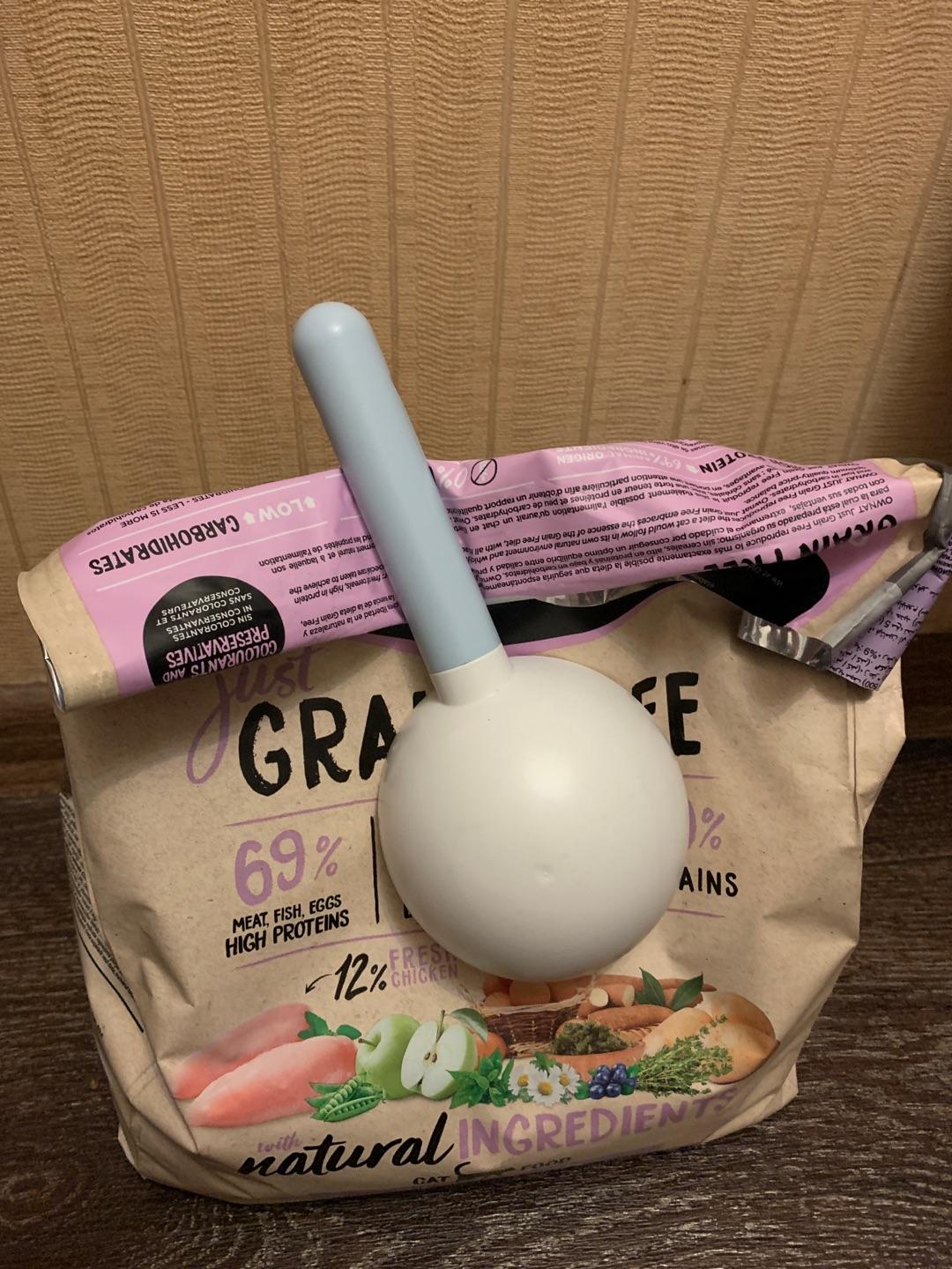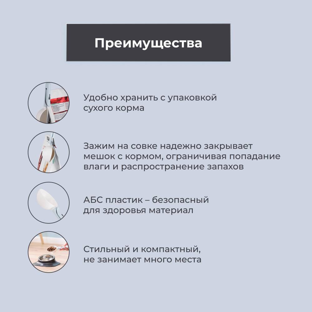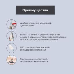 - Зажим на совке надежно закрывает мешок с кормом, ограничивая попадание влаги и распространение запахов.