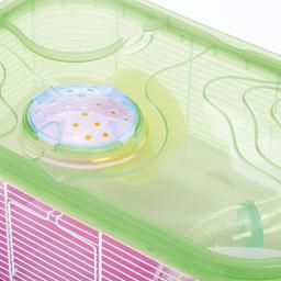 - В клетке предусмотрено все, что может быть необходимо: 2 этажа перемещаться по которым можно через тоннель, входящий в комплект; маленький домик, где питомец может спать или отдыхать, колесо для развлечений.