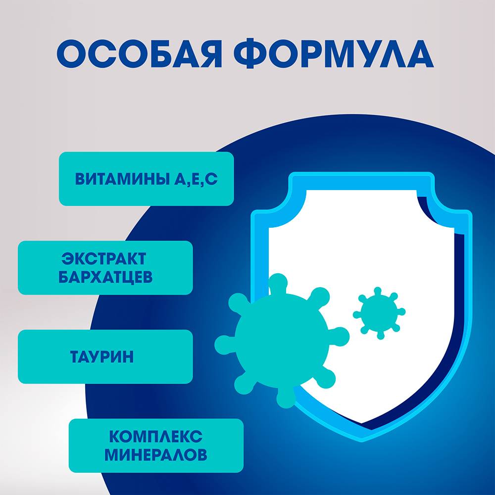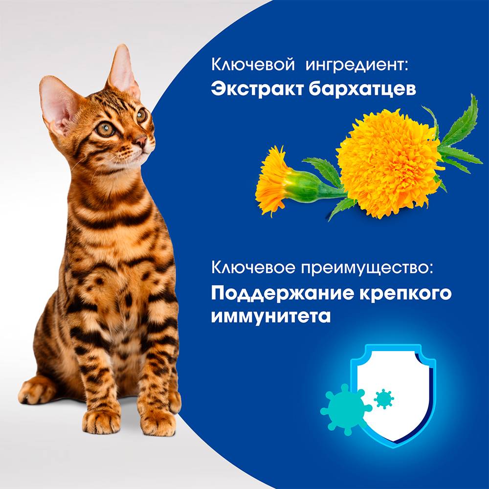 - Особый комплекс антиоксидантов (витамины А, Е, С, таурин и экстракт бархатца) помогает организму поддержать здоровый иммунитет при соблюдении рекомендаций по кормлению.