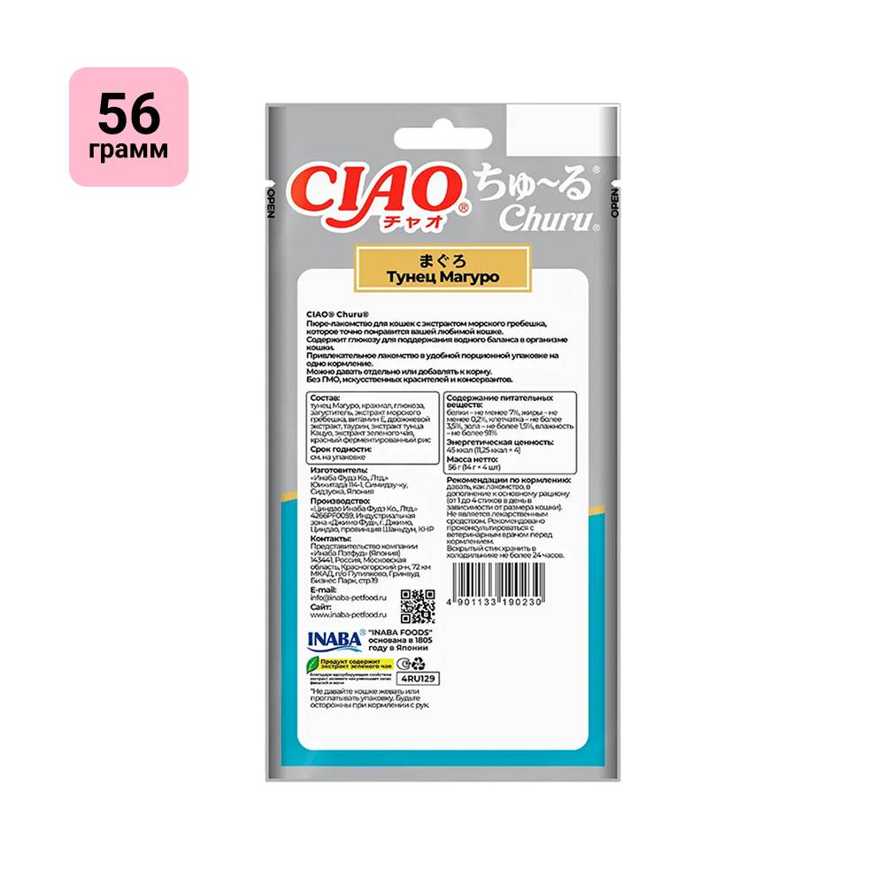 - Пюре-лакомство CIAO Churu (ЧАО ЧУРУ) изготавливается на основе тунца Магуро с добавлением экстракта морского гребешка для увеличения вкусовой привлекательности.