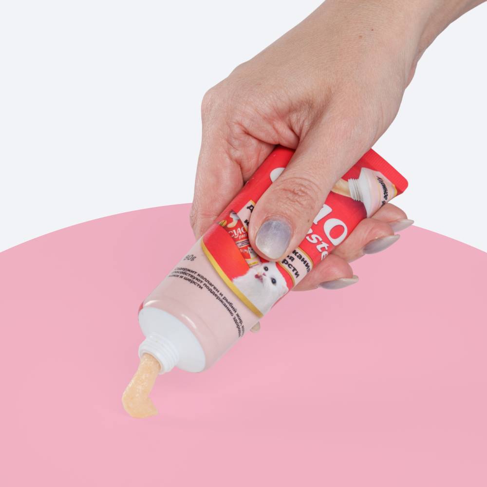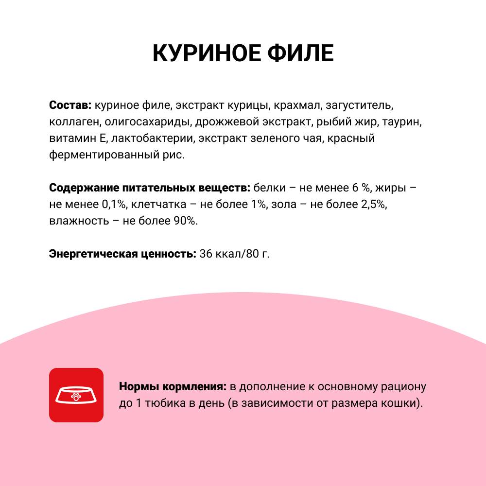 Функциональное лакомство паста CIAO Paste (ЧАО ПЭЙСТ) для кошек на основе филе куриного филе с лактобактерями. Содержит коллаген и рыбий жир, которые способствуют поддержанию здоровья кожи и шерсти.