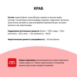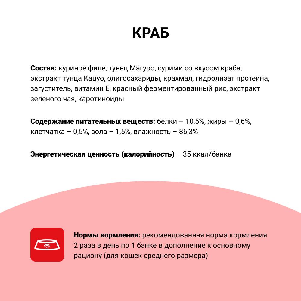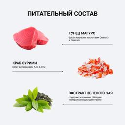 куриное филе, тунец Магуро, сурими со вкусом краба, экстракт тунца Кацуо, крахмал, гидролизат протеина, загуститель, олигосахариды, витамин Е, экстракт зеленого чая, каротиноиды, красный ферментированный рис.