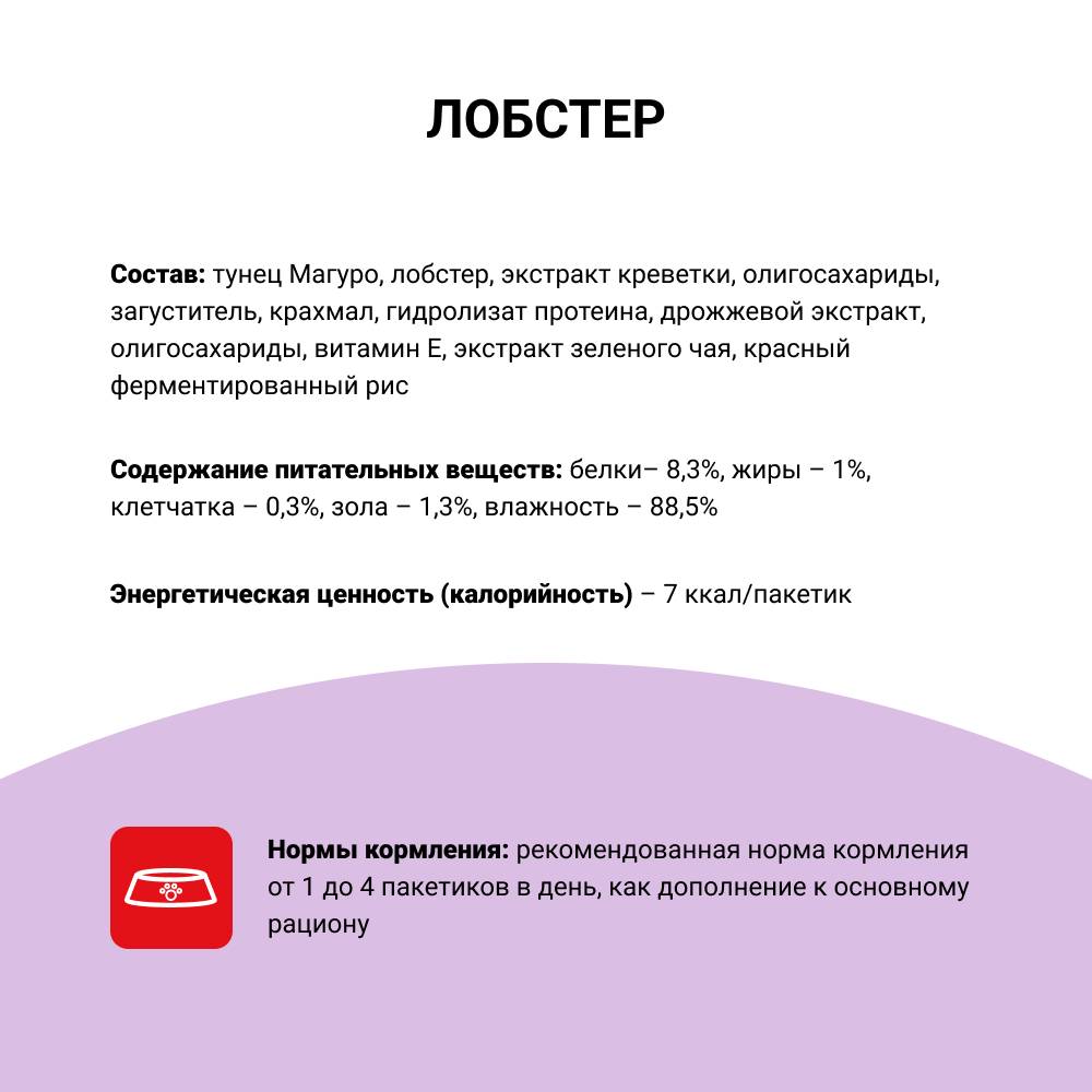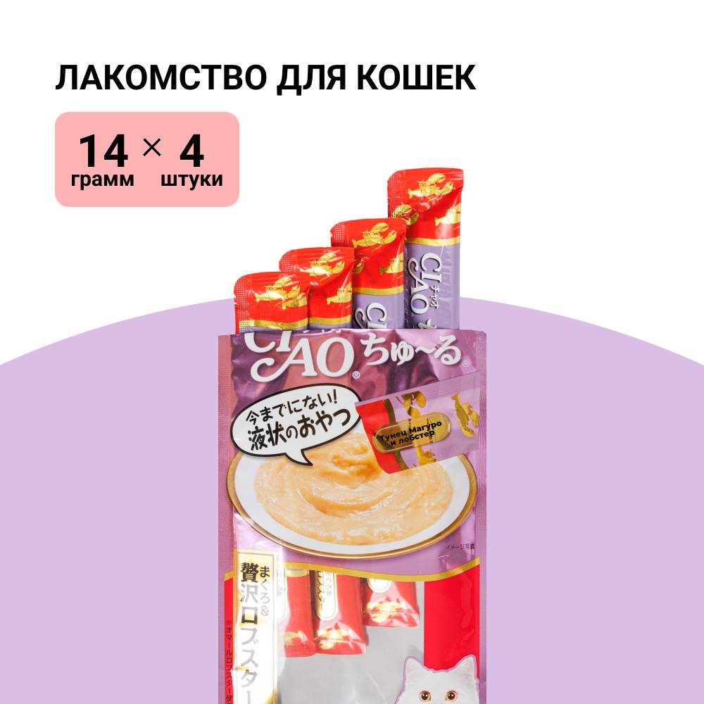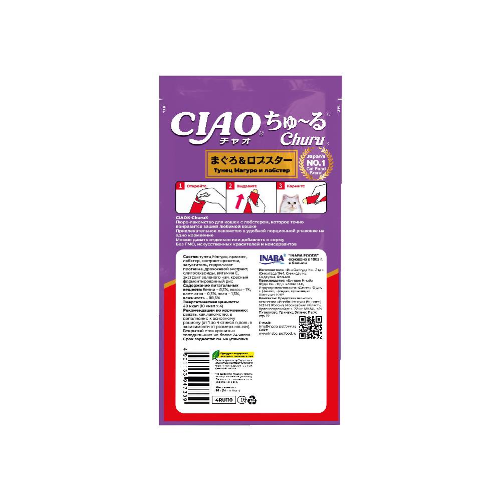 Супер-премиальное лакомство пюре CIAO Churu (ЧАО ЧУРУ) для кошек на основе кусочков мяса глубоководного тунца Магуро с добавлением лобстера от японского производителя Inaba изготовлено исключительно из натуральных полезных ингредиентов и отличается высоким процентом влажности, благодаря чему поддерживается водный баланс организма кошки. Кремовая текстура, напоминающая пюре или суп, подойдет даже самым привередливым кошкам и котам или кошкам с чувствительным пищеварением.