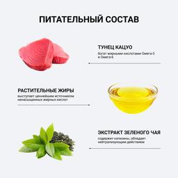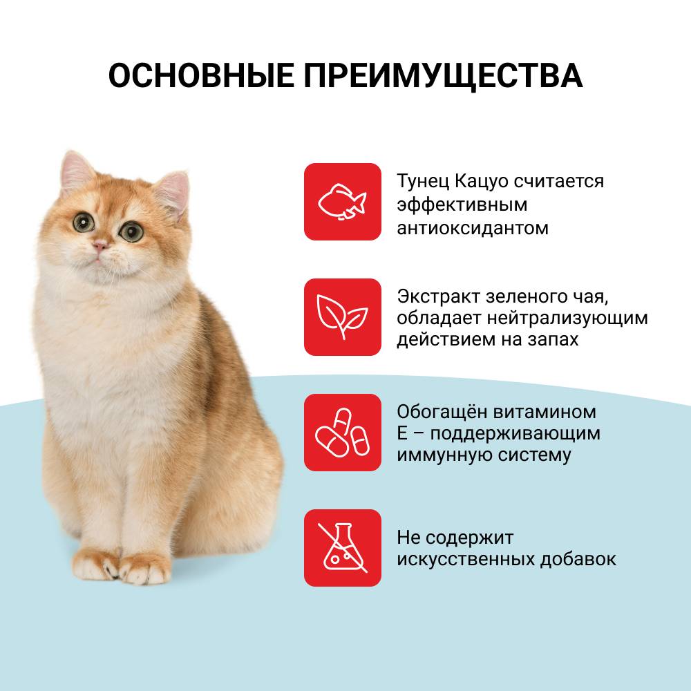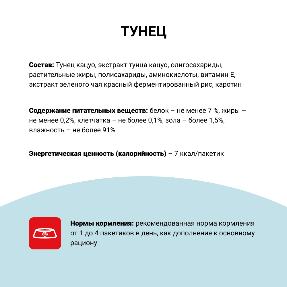 Во все продукты добавлен экстракт зелёного чая, который, благодаря содержанию катехина, обладает нейтрализующим действием на запах содержимого кишечника. Пюре-лакомство обогащено витамином Е — натуральным антиоксидантом, поддерживающим иммунитет животного. Не содержит искусственных добавок, красителей и консервантов.