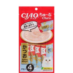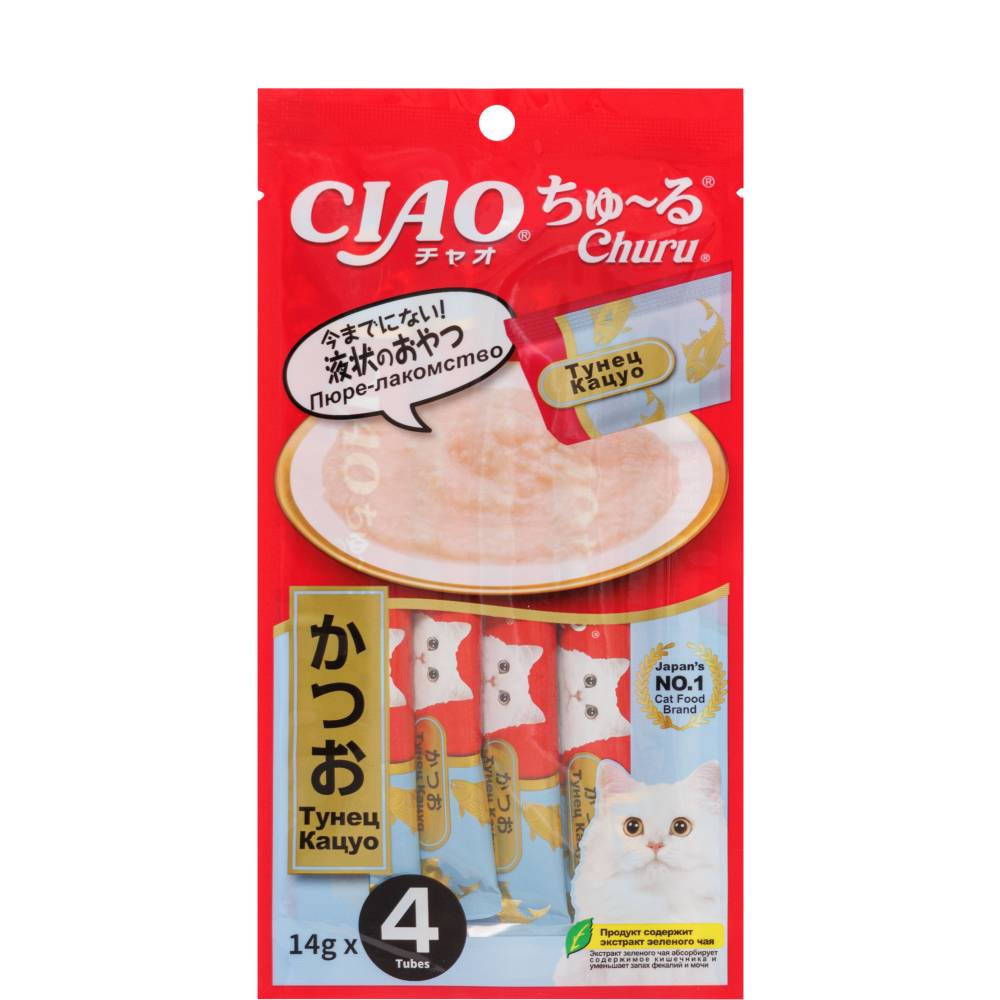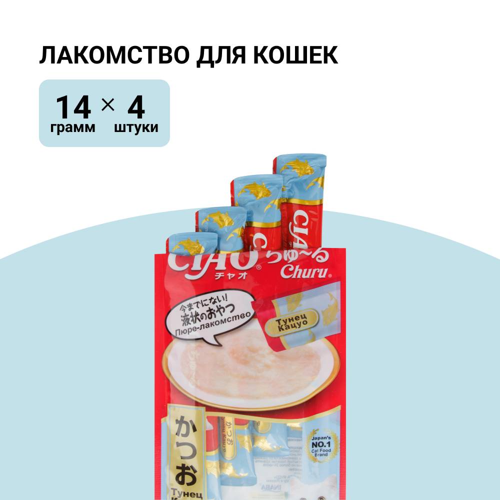Супер-премиальное лакомство пюре CIAO Churu (ЧАО ЧУРУ) для кошек на основе кусочков мяса тунца Кацуо от японского производителя Inaba изготовлено исключительно из натуральных полезных ингредиентов и отличается высоким процентом влажности, благодаря чему поддерживается водный баланс организма кошки. Кремовая текстура, напоминающая пюре или суп, подойдет даже самым привередливым кошкам и котам или кошкам с чувствительным пищеварением.
