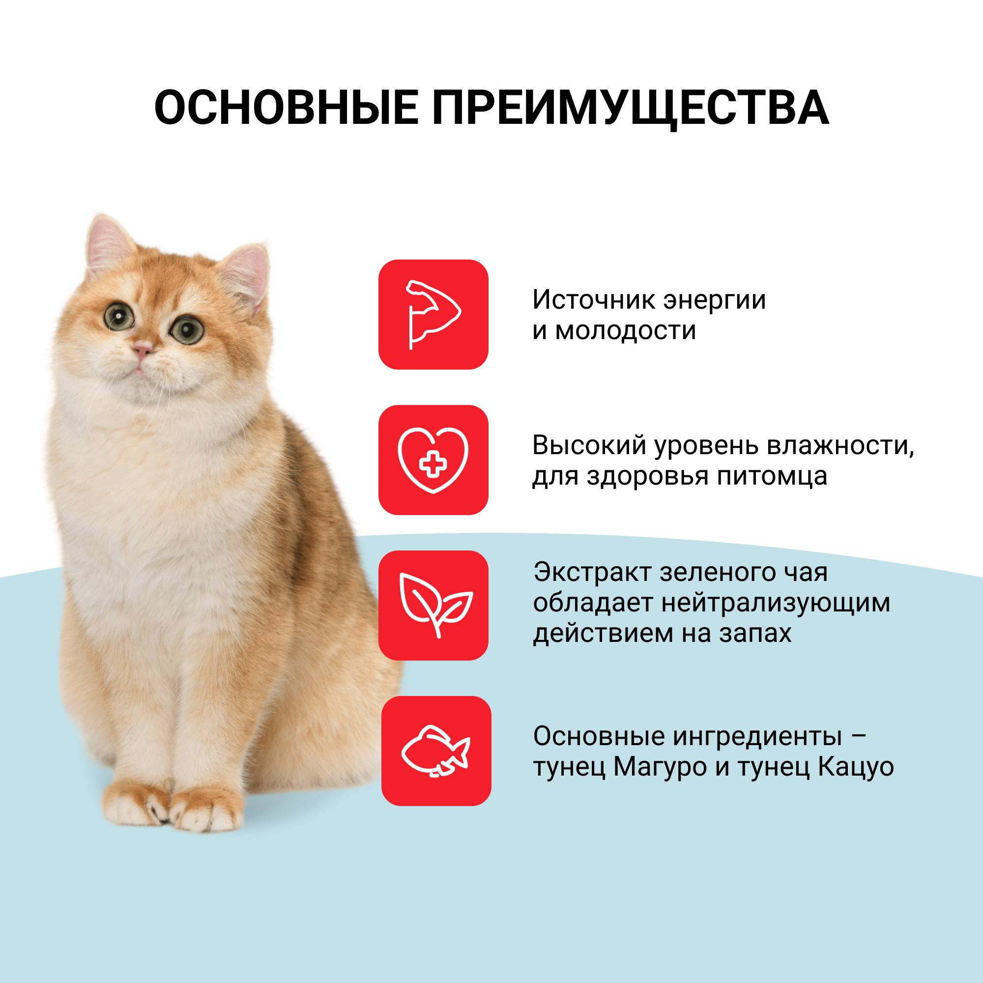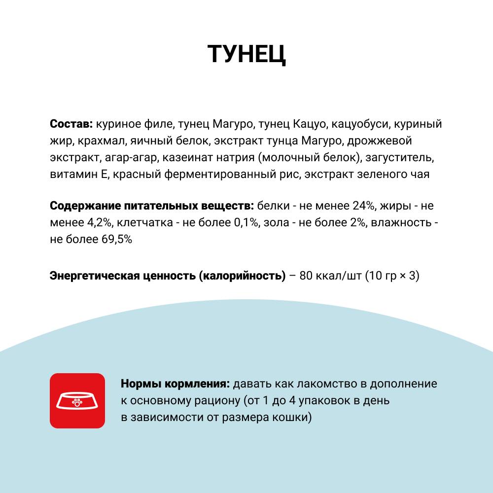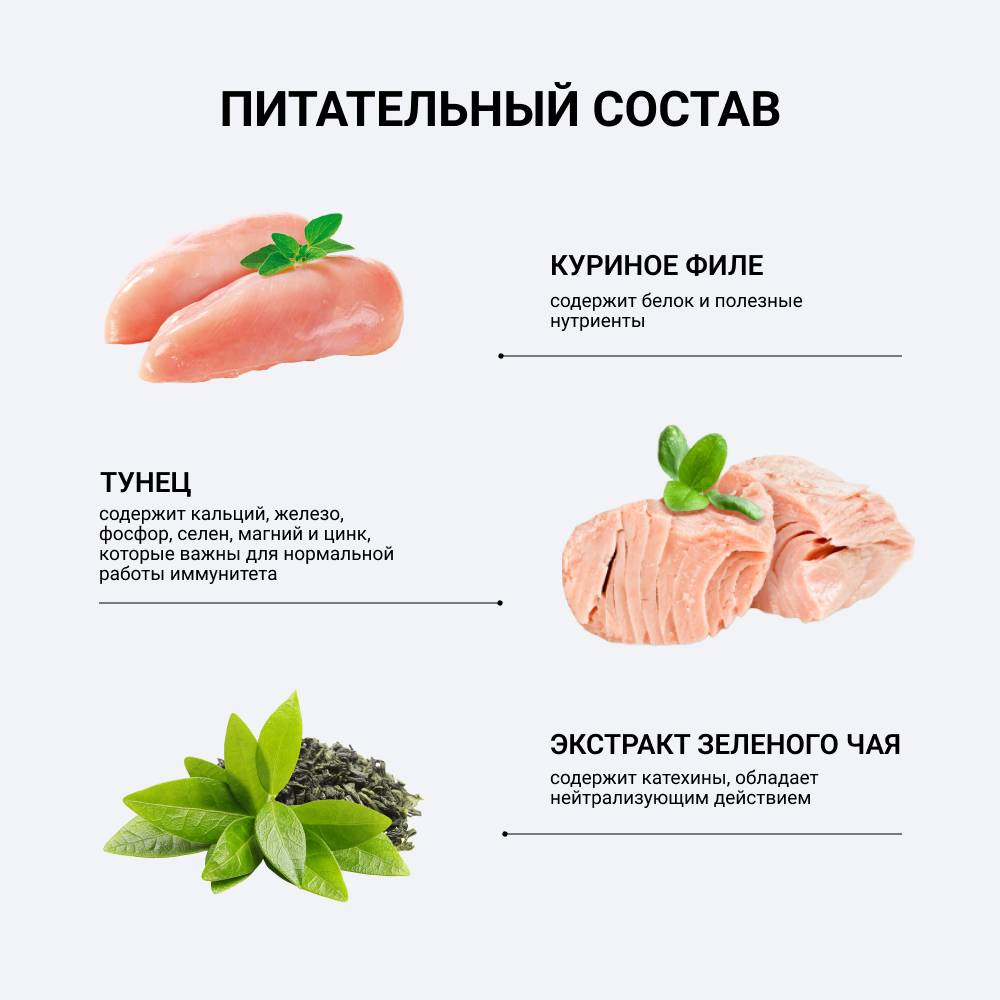 - Основные ингредиенты — глубоководный тунец и филе фермерской курицы.