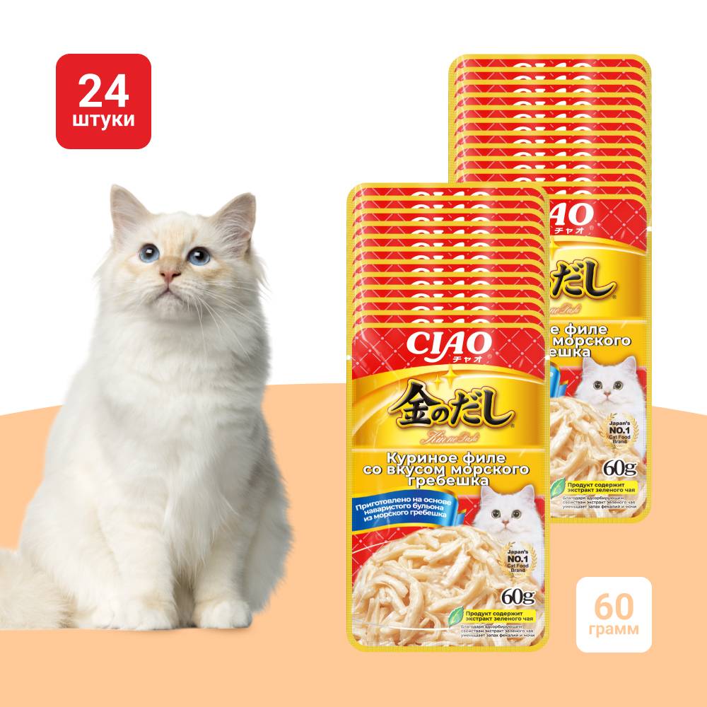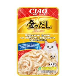 Влажный корм для кошек Inaba Ciao Kinnodashi в пауче приготовлен на основе кусочков мяса курицы с добавлением гребешка в аппетитном насыщенном бульоне золотистого цвета.