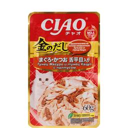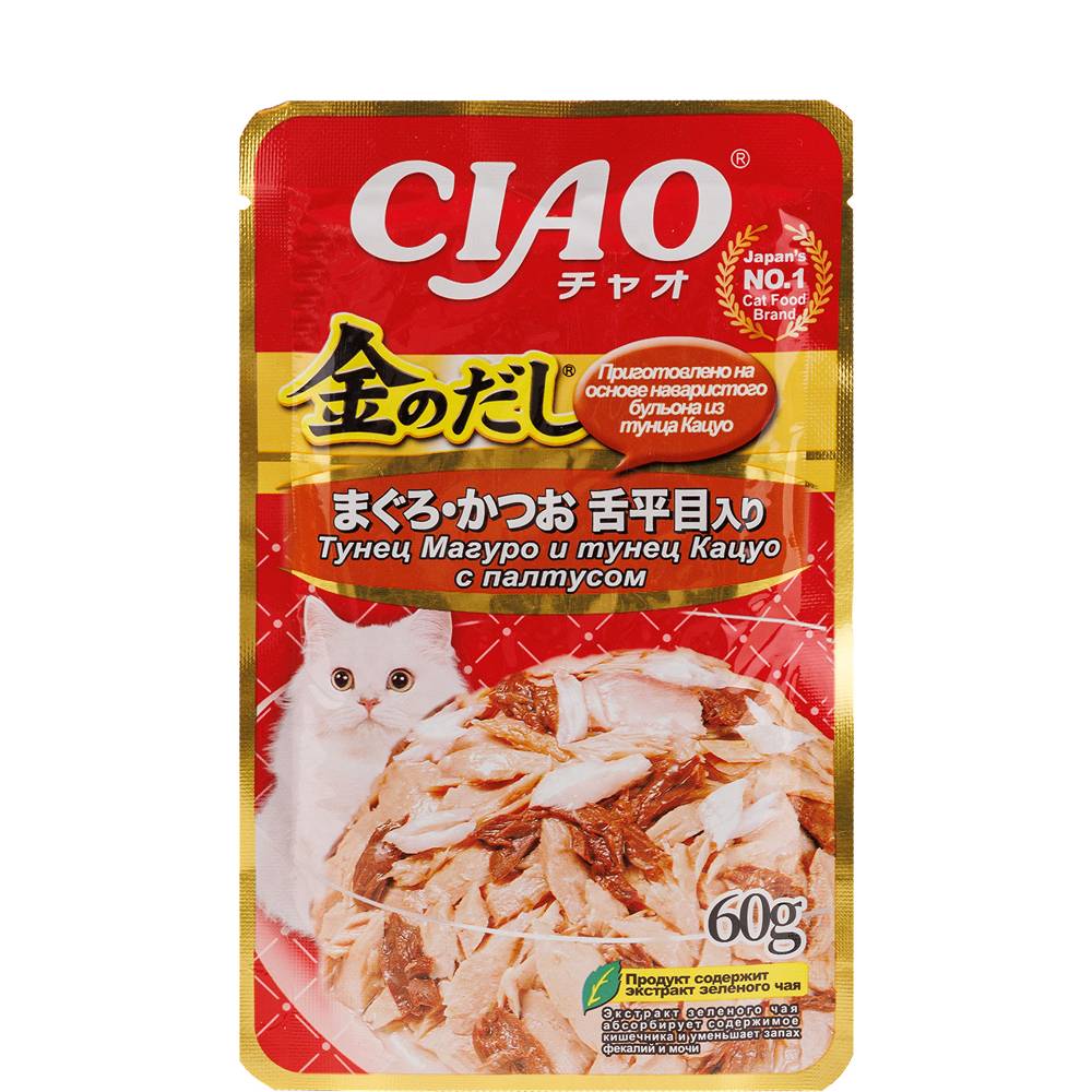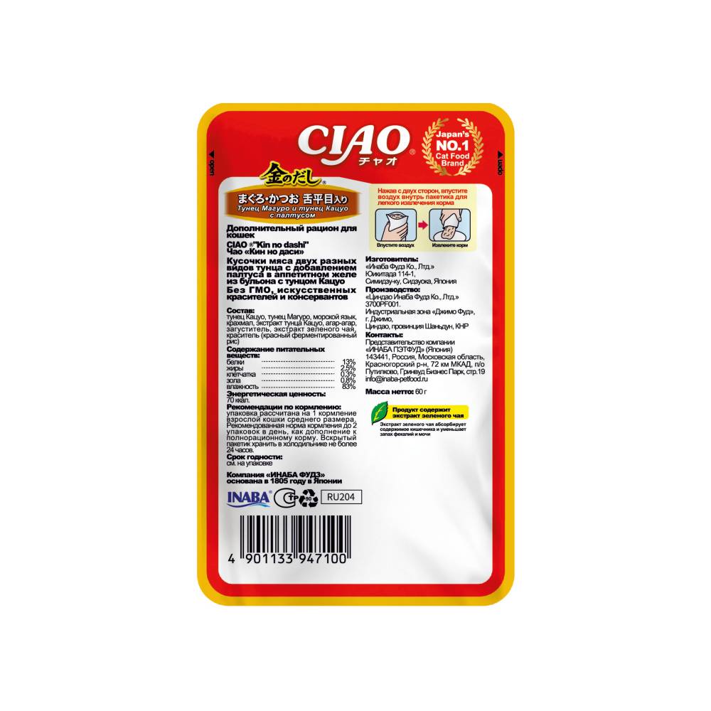 - Суперпремиальный влажный корм для кошек Kinnodashi от японского производителя Inaba приготовлен на основе нежных кусочков мяса двух разных видов глубоководного тунца с добавлением палтуса в аппетитном насыщенном бульоне золотистого цвета.
