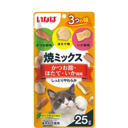 Супер-премиальное лакомство Yakimiksu (ЯКИМИКСУ) для кошек cо вкусом кацуобуси (стружка валеного тунца), морского гребешка и кальмара. Ассорти на основе филе фермерской курицы и кусочков мяса тунца Кацуо от японского производителя Inaba изготовлено исключительно из натуральных полезных ингредиентов. В каждой пачке микс запеченных снеков с тремя разными вкусами и каждый вкус имеет свою уникальную форму (рыбка, кальмар, морской гребешок и тд.), поэтому понравятся даже самым привередливым кошкам и котам.