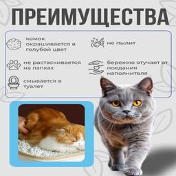 - Окрашивание и впитывание - внутри каждой гранулы - голубой индикатор и водопоглощающий полимер. Комок становится голубого цвета, не окрашивает лапы и стены лотка. Расход 7 л. наполнителя 2-3 мес. на одну кошку.