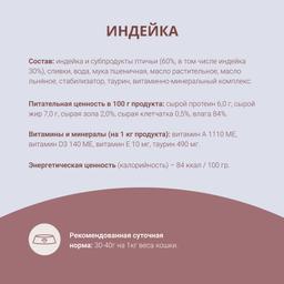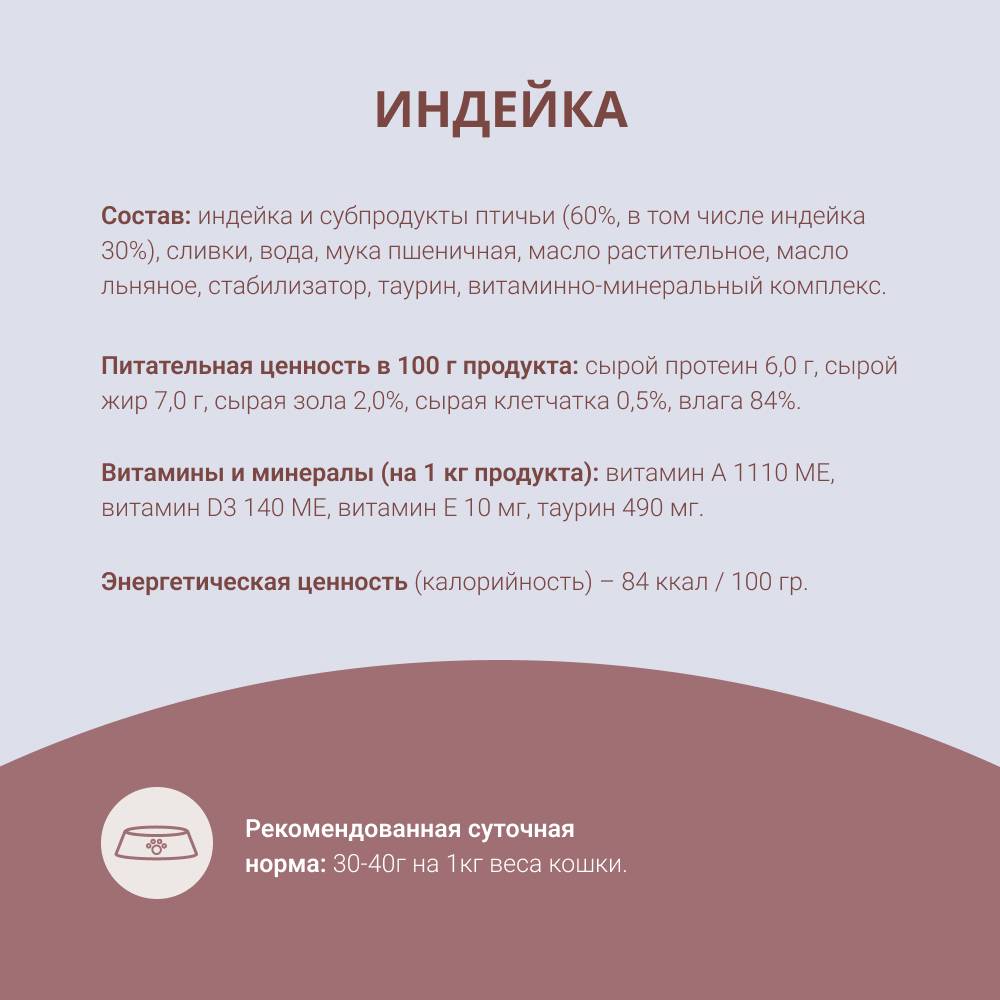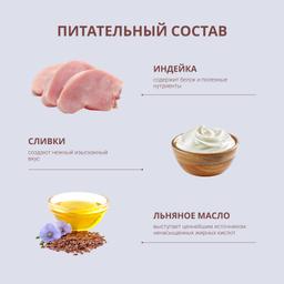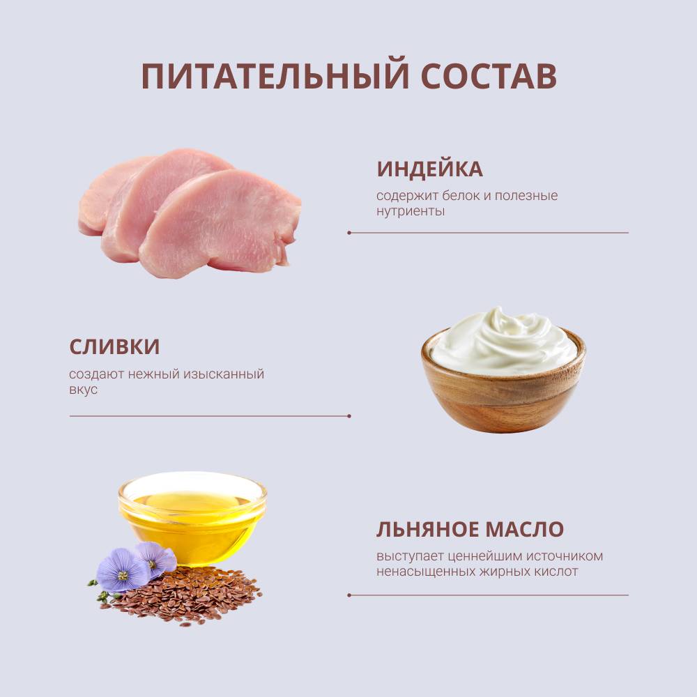 индейка и субпродукты птичьи (60%, в том числе индейка 30%), сливки, вода, мука пшеничная, масло растительное, масло льняное, стабилизатор, таурин, витаминно-минеральный комплекс.