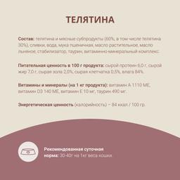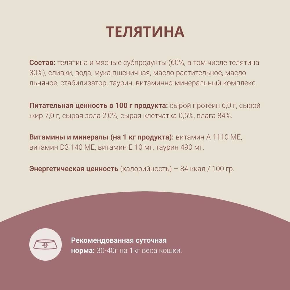 телятина и мясные субпродукты (60%, в том числе телятина 30%), сливки, вода, мука пшеничная, масло растительное, масло льняное, стабилизатор, таурин, витаминно-минеральный комплекс.