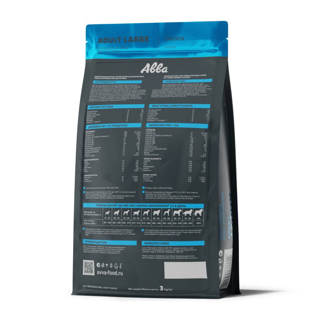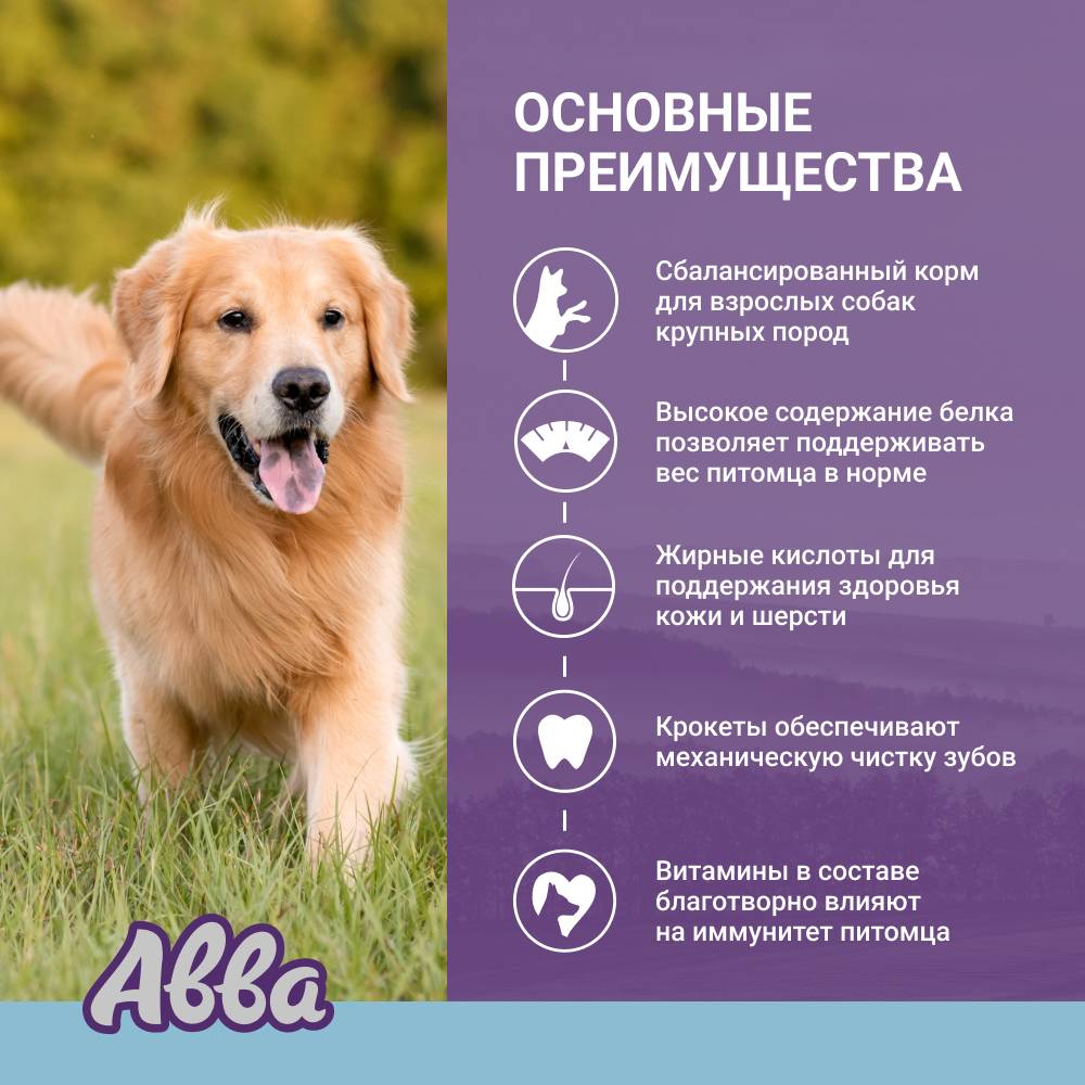 АВВА Premium Adult Курица – это полнорационный, сбалансированный корм для взрослых собак крупных пород, который учитывает все тонкости питания. В составе глюкозамин и хондроитин для поддержания здоровья и работы суставов, что очень важно для крупных собак. Улучшенный состав без пшеницы.